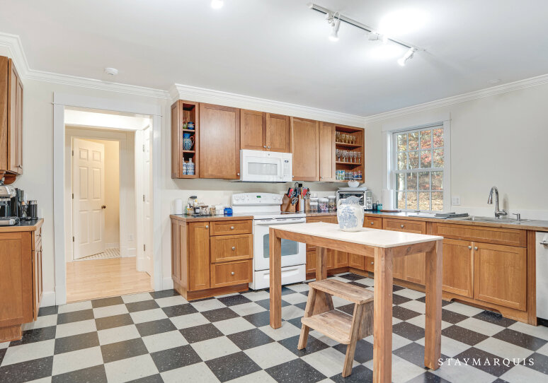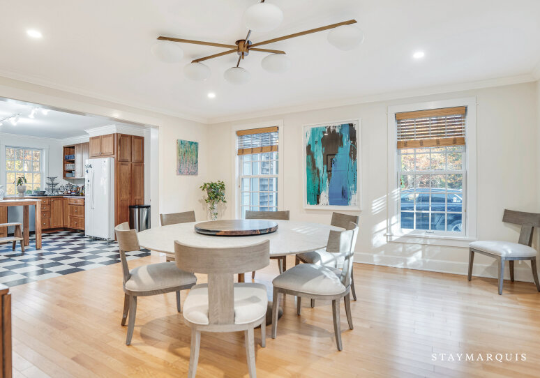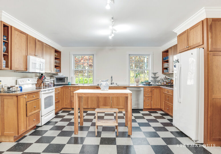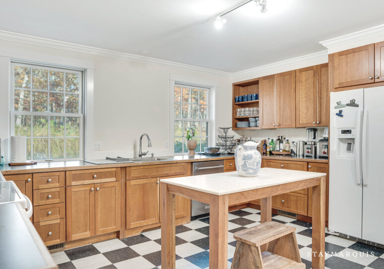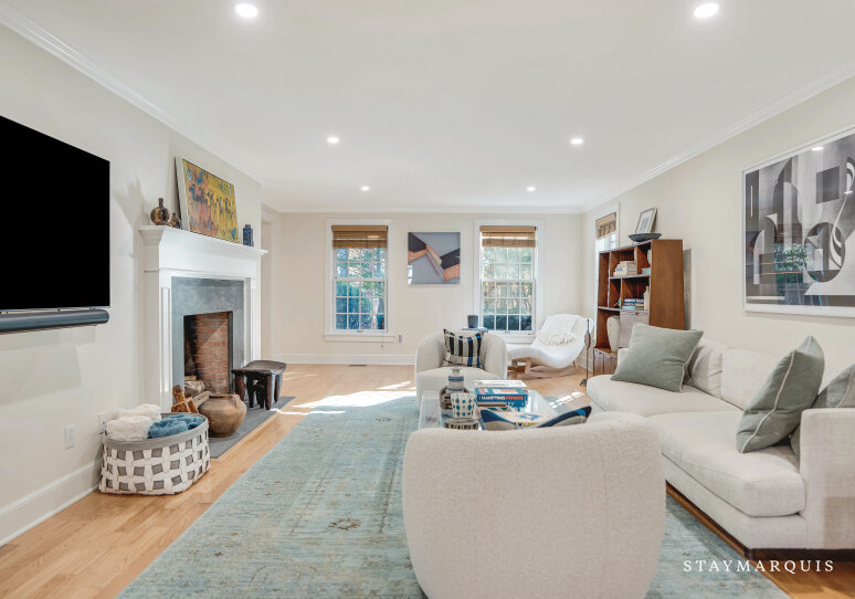 Inside, the home opens to bright, welcoming rooms that instantly feel like home. The spacious living room, anchored by a wood-burning fireplace, is perfect for gathering with friends or curling up after a day at the beach. The formal dining room offers an elegant setting for shared meals, while the large, fully equipped kitchen has everything needed for home-cooked dinners or casual brunches. A separate den, featuring another wood-burning fireplace and a classic wet bar, provides a comfortable space for evening cocktails or family movie nights. Sunlight fills every room through oversized windows that look out toward the trees and water beyond, creating a natural connection between indoors and out. For guests who need to work remotely, the detached loft above the garage offers a quiet private office — or simply a tranquil hideaway for reading and reflection.