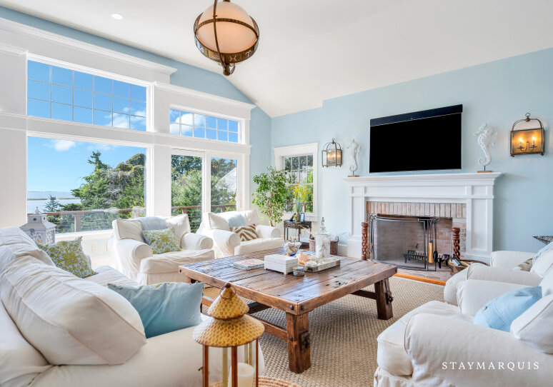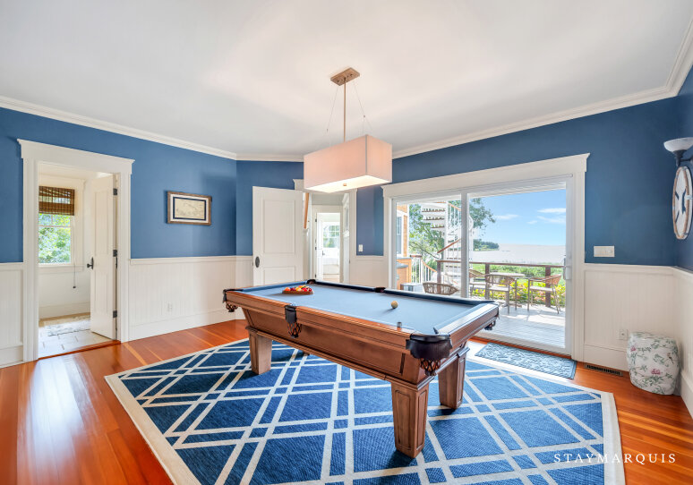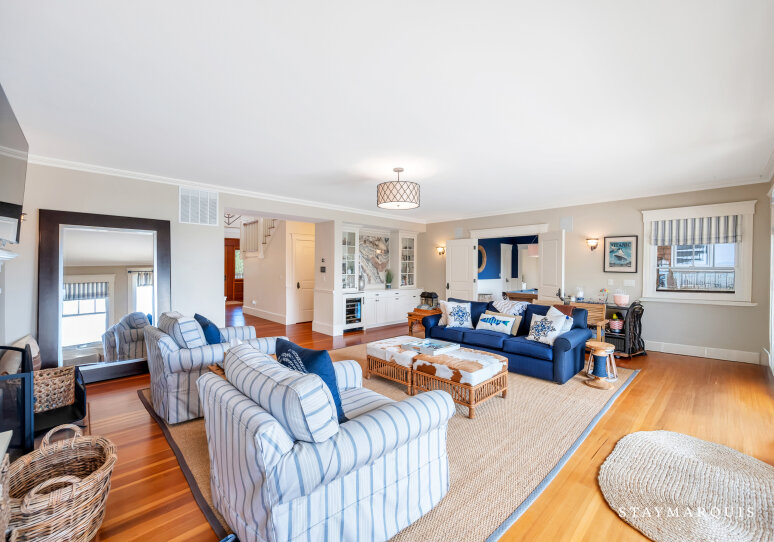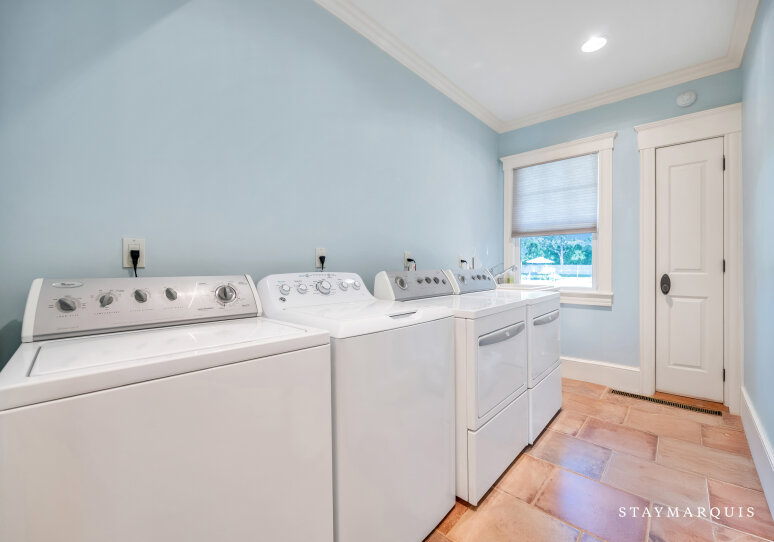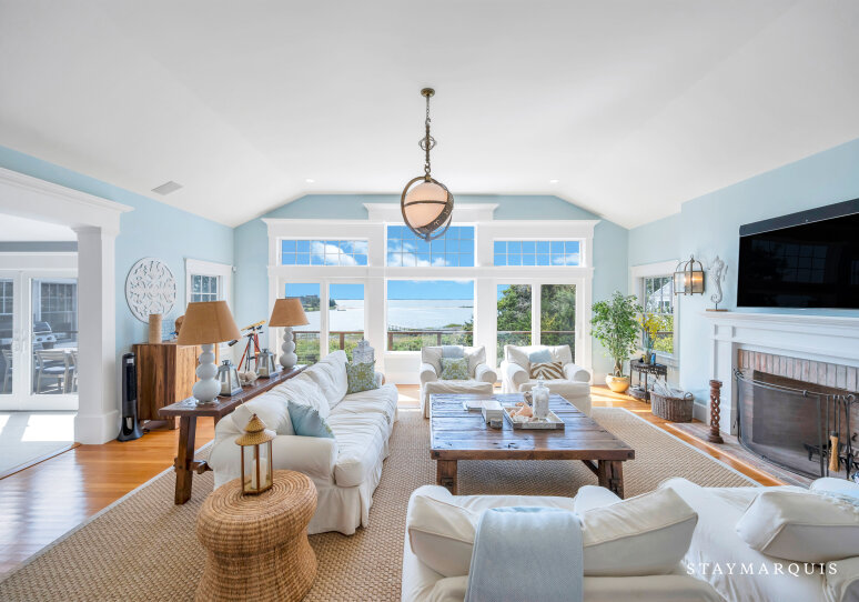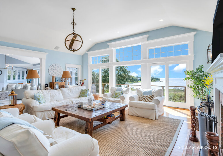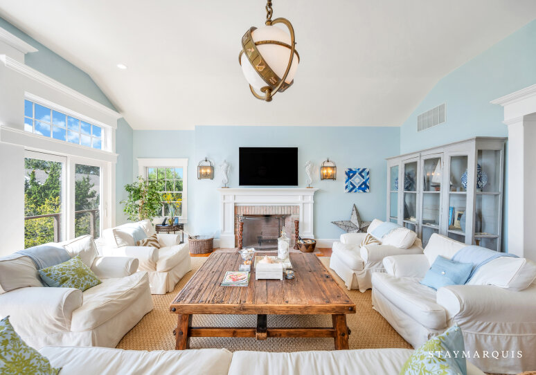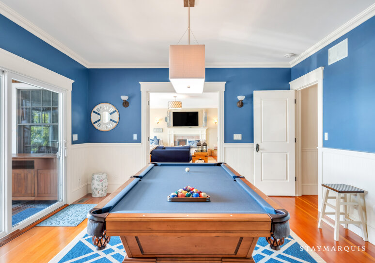 Inside, the home embodies timeless Hamptons style, blending modern luxury with classic charm. Light floods through oversized windows, showcasing stunning water views throughout the common areas. The open-concept layout allows easy flow between the chef’s kitchen, dining room, and living areas. The gourmet kitchen features high-end appliances, a spacious island for entertaining, and everything needed for memorable meals. The formal living room offers plush seating, a fireplace, and breathtaking views, while the secondary living room and bar open directly to the backyard through sliding glass doors. Guests will love the first-floor game room with a pool table and the lower-level media room with cozy sofas, a fireplace, a kitchenette, and a walk-in wine cellar. Every detail has been curated for comfort and style, complete with modern amenities such as central AC, WiFi, and laundry facilities.