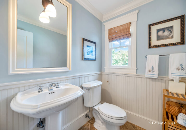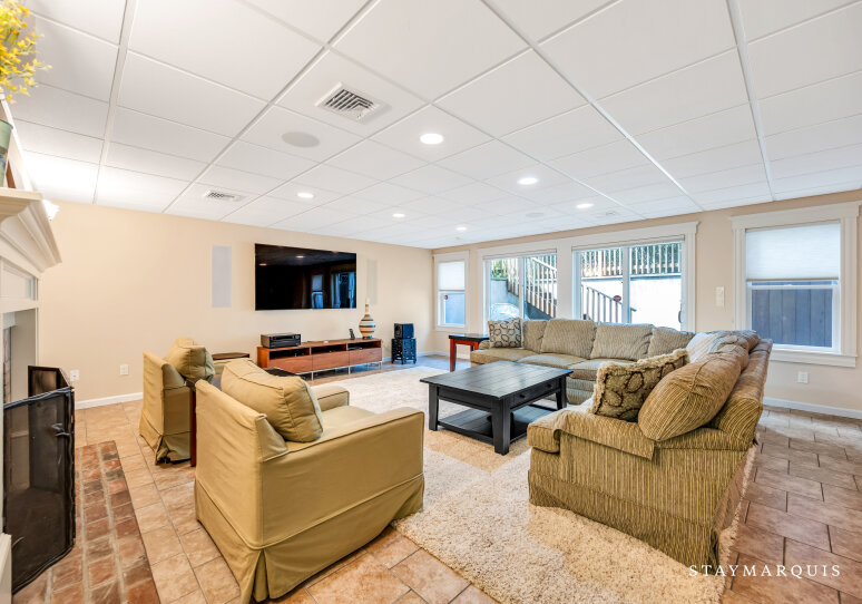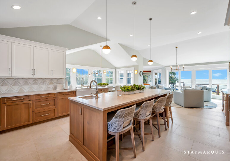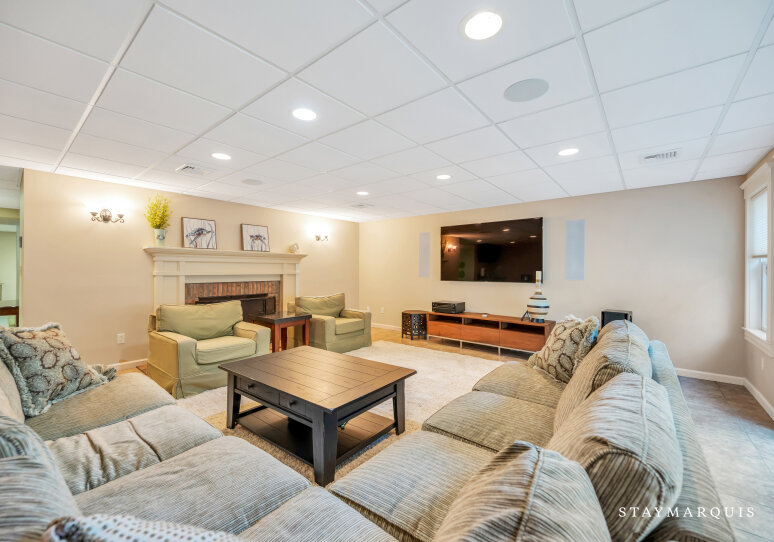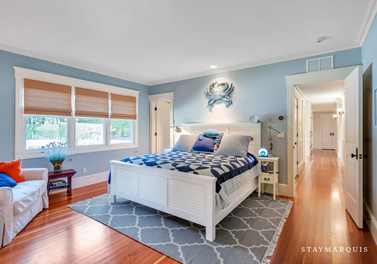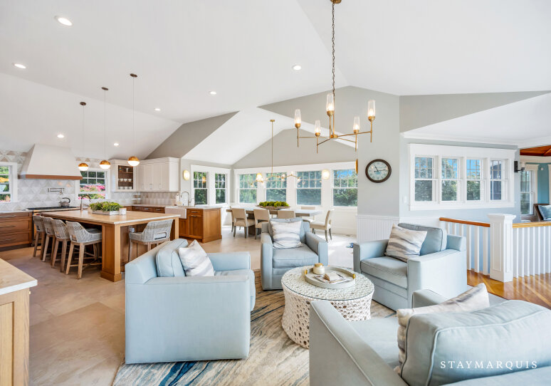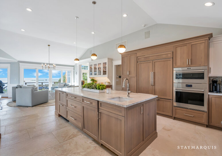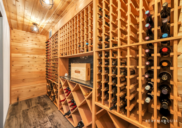 Inside, the home embodies timeless Hamptons style, blending modern luxury with classic charm. Light floods through oversized windows, showcasing stunning water views throughout the common areas. The open-concept layout allows easy flow between the chef’s kitchen, dining room, and living areas. The gourmet kitchen features high-end appliances, a spacious island for entertaining, and everything needed for memorable meals. The formal living room offers plush seating, a fireplace, and breathtaking views, while the secondary living room and bar open directly to the backyard through sliding glass doors. Guests will love the first-floor game room with a pool table and the lower-level media room with cozy sofas, a fireplace, a kitchenette, and a walk-in wine cellar. Every detail has been curated for comfort and style, complete with modern amenities such as central AC, WiFi, and laundry facilities.