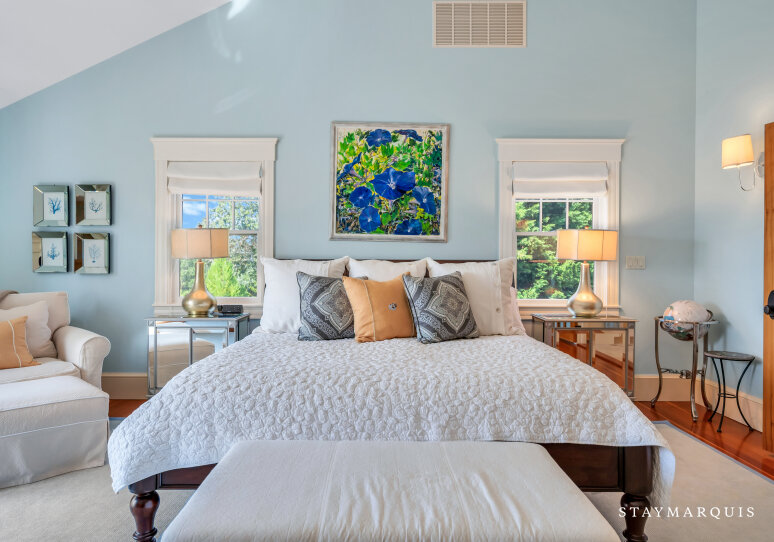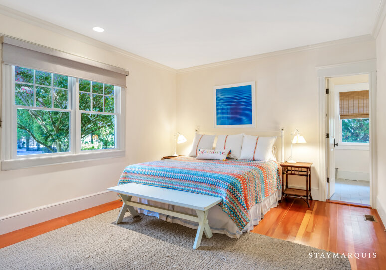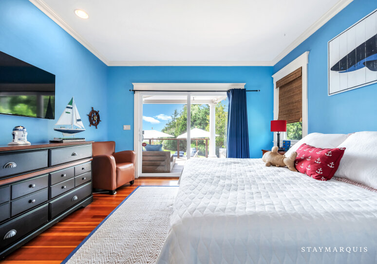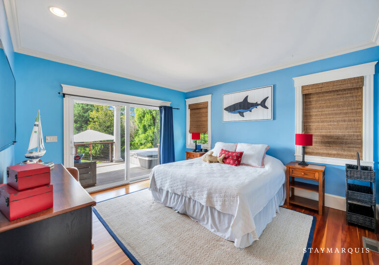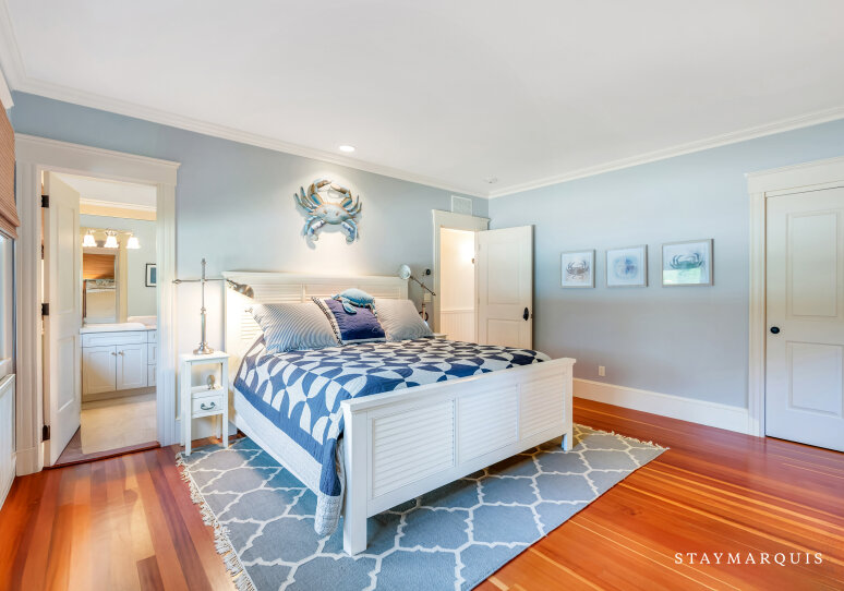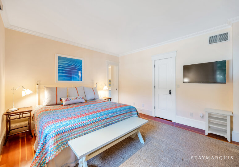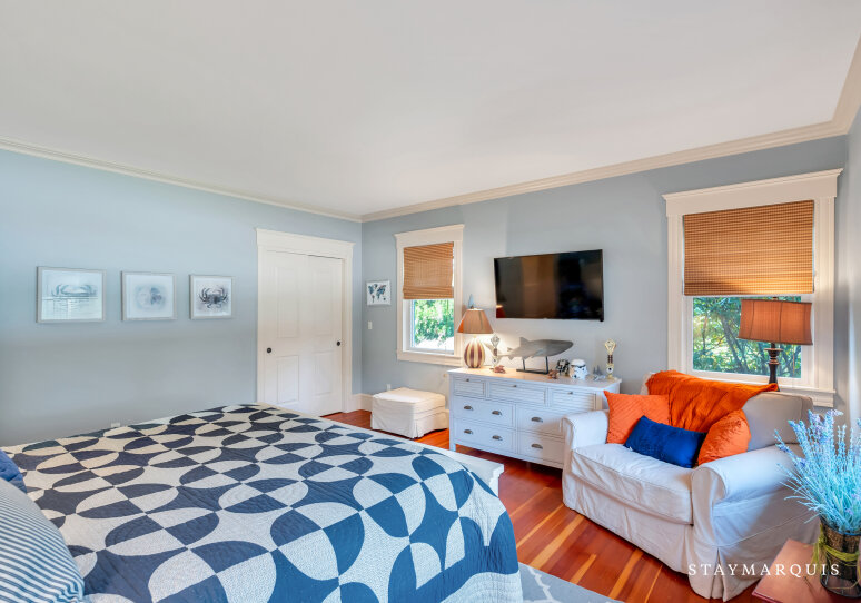 - Bedroom 1 - Primary: One King Bed, 2nd Floor, Air Conditioning, Full Ensuite Bathroom, Streaming TV, Walk-in Closet, Balcony/Deck