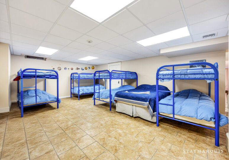 The bedroom suites are havens of rest, each outfitted with fresh linens and spa-like bathrooms. The primary suite, located upstairs, features a king bed, a private balcony overlooking the pool, and a luxurious ensuite bathroom with a soaking tub, walk-in shower, and double vanity. Four additional guest bedrooms on the first floor each offer king beds, with three boasting ensuite baths and one with a nearby hall bath. The lower level provides additional accommodations with an open sleeping area featuring four bunk beds, one double bed, and a full bathroom — perfect for children or larger groups. A main-floor powder room adds convenience.