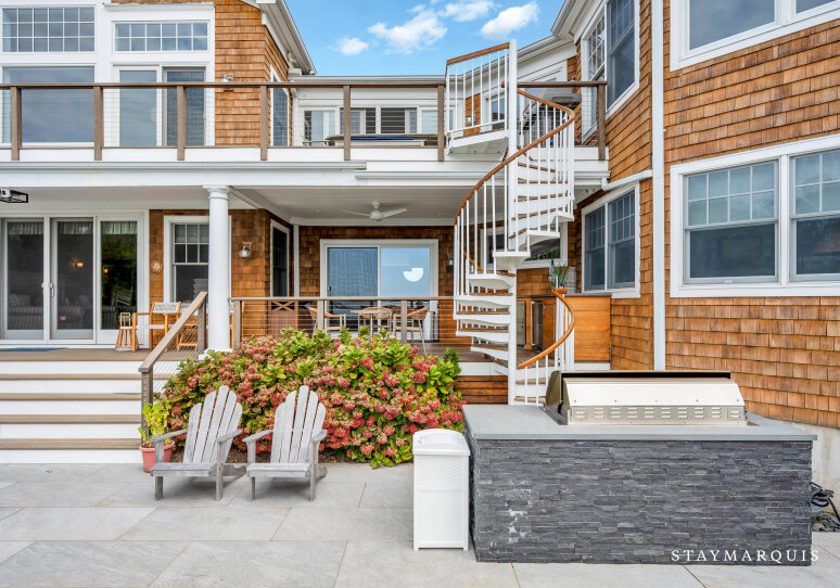 Step outside to your own resort-style oasis. The secluded backyard, surrounded by lush landscaping, frames sweeping panoramic water views. The private heated pool, hot tub and sundeck invite you to bask in the sunshine, while the outdoor kitchen and top-of-the-line gas grill make al fresco dining a joy. Gather at the large outdoor table with water views, or sip morning coffee and evening cocktails on plush lounge chairs and sofas. Beyond the pool, a private tennis court that doubles as a basketball court ensures recreation for all ages. An upper deck off the main living spaces offers yet another spot for dining with serene vistas, while the outdoor shower and expansive green space complete the picture of a true private resort.