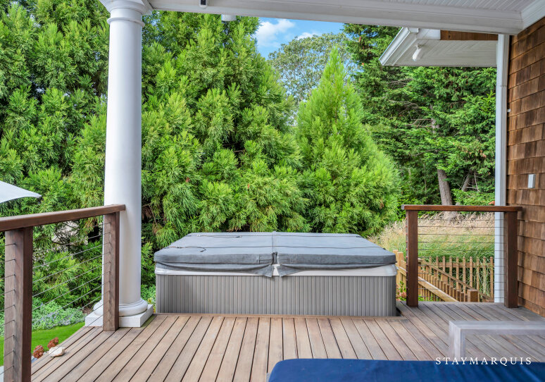 Tennis Court (Private), Waterfront, Deck/Patio (Uncovered), Lounge Chairs, Patio Furniture (Table, Chairs, Umbrella), Grill (Gas), Outdoor Shower (Hot + Cold Water), Balcony, Kayak/Canoe, Paddle Board, Dock, Tennis Equipment (Rackets, Balls), Bicycle, Beach Chairs, Beach Umbrella, Cooler, Private Pool (Outdoor, Heated, Saltwater), Hot Tub (Freestanding Hot Tub)