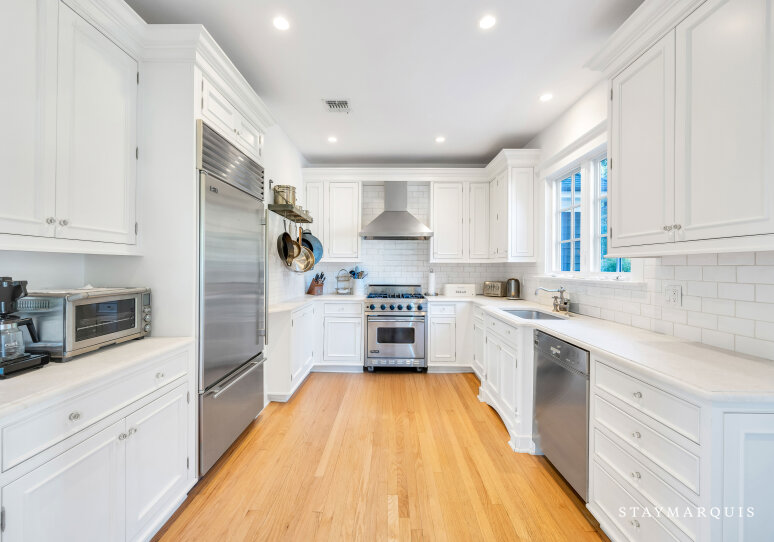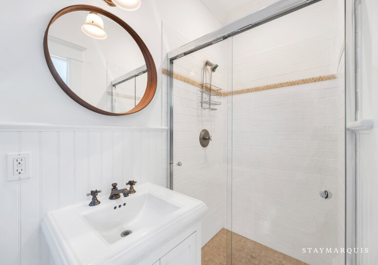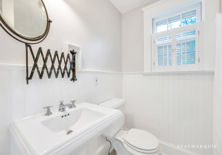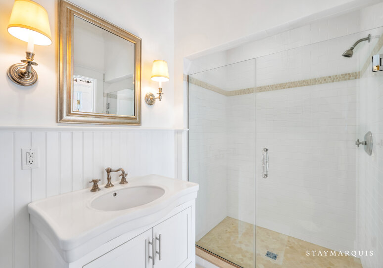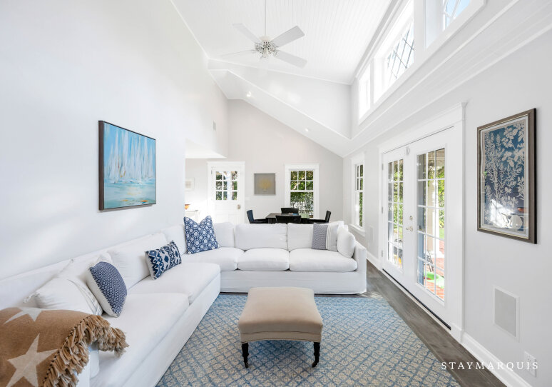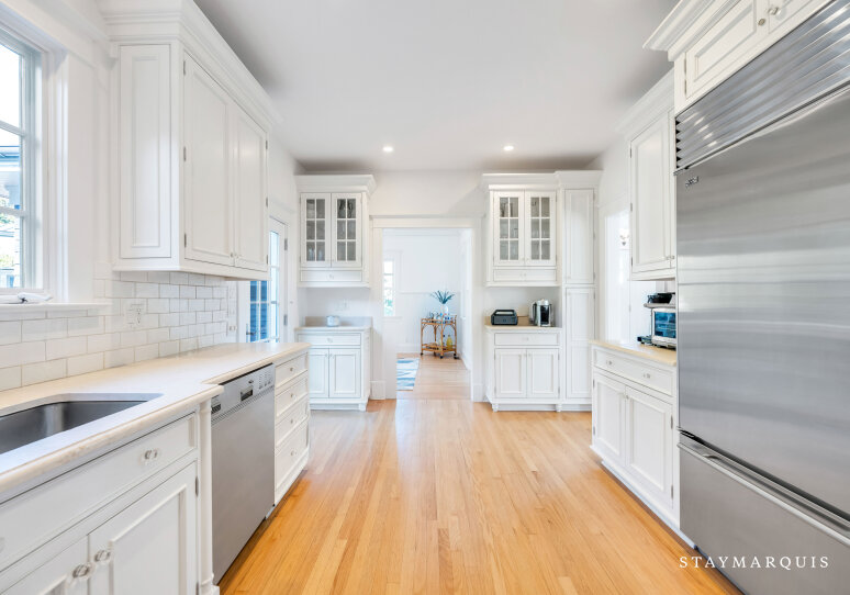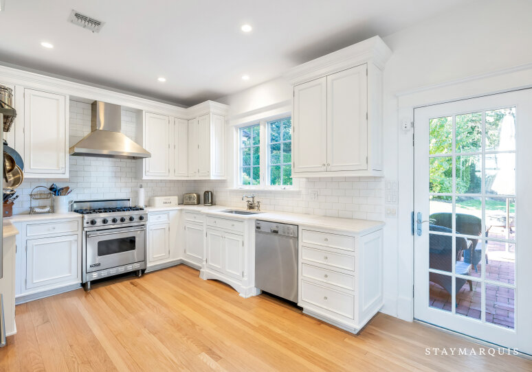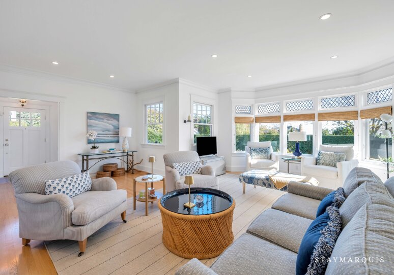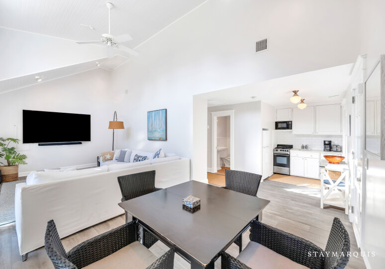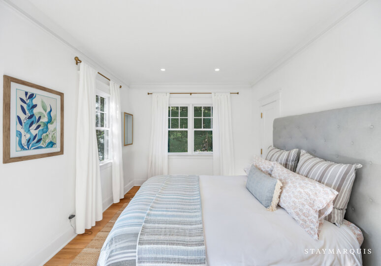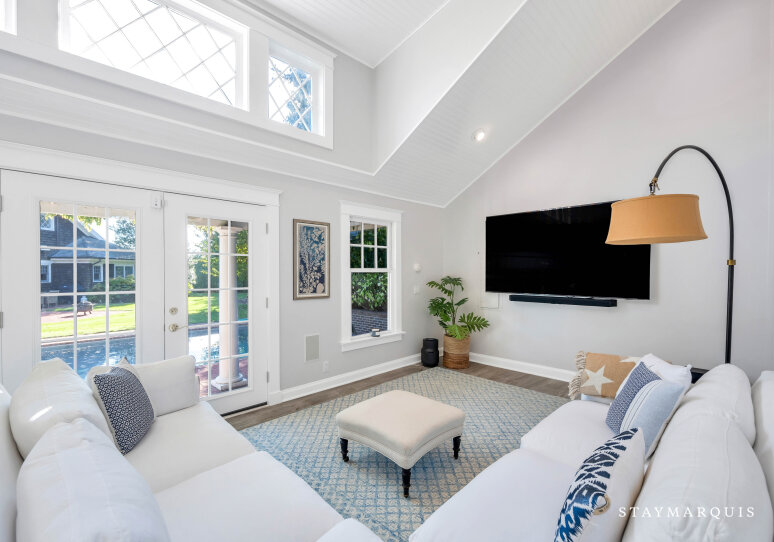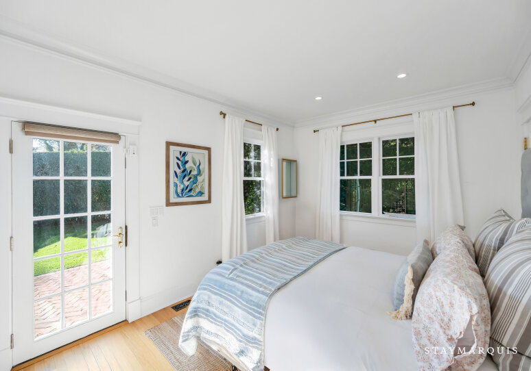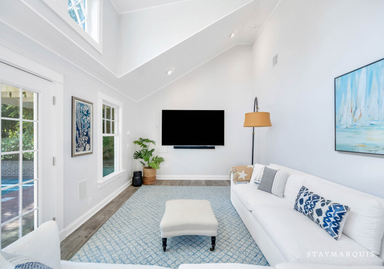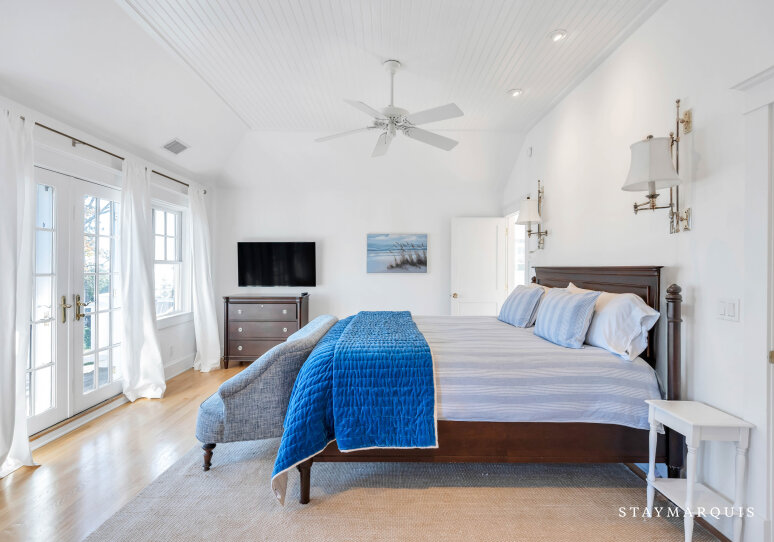 Step inside, and you’re welcomed into generously proportioned common areas boasting bright interiors and a traditional floor plan that invites both connection and elegance. The formal living room flows into a gracious dining area, and then into the chef’s kitchen — outfitted with premium appliances, gleaming countertops, and thoughtful stocking of essentials, so you can entertain or unwind without missing a beat. Large windows and glass doors throughout capture the shimmering water views and let light pour in, reinforcing that seamless indoor-outdoor lifestyle. The modern comforts — central air conditioning, WiFi for working or streaming, washer and dryer, and welcoming living spaces — strike a perfect balance between purposefully relaxed and beautifully boutique. In the guest house you will find a private kitchen, living area, bedroom and bath — your flexible bonus space is as stylish as it is comfortable.