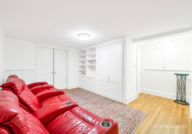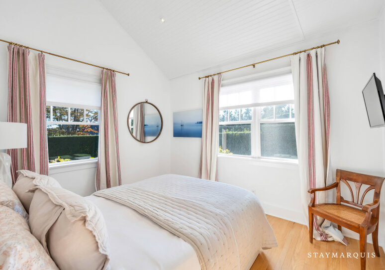 When it’s time to retire for the evening, the home delivers indulgent comfort. Up on the second floor, the primary bedroom offers a king-sized bed, its own private balcony overlooking the bay and green lawn, and a large en-suite bathroom that completes the sense of retreat and calm. On the main level you’ll find Guest Bedroom 1 with a queen bed, direct backyard access and its own en-suite bath. Guest Bedroom 2, also on the main level, features a queen bed and shares access to a hall bath nearby — perfect for children or friends. The detached guest house rounds things out: Guest Bedroom 4 is housed here, with another queen bed and its own private en-suite bath. With a total of four beautifully appointed bedrooms and four full bathrooms, the property offers ideal privacy and comfort for all.