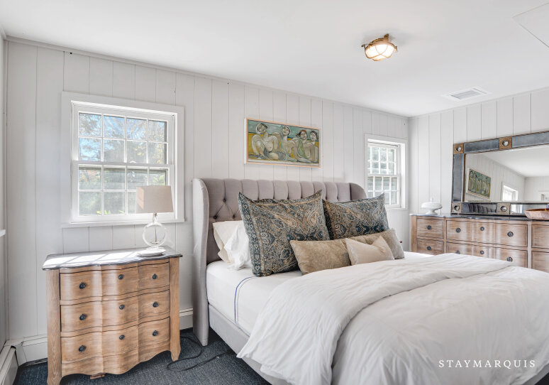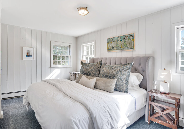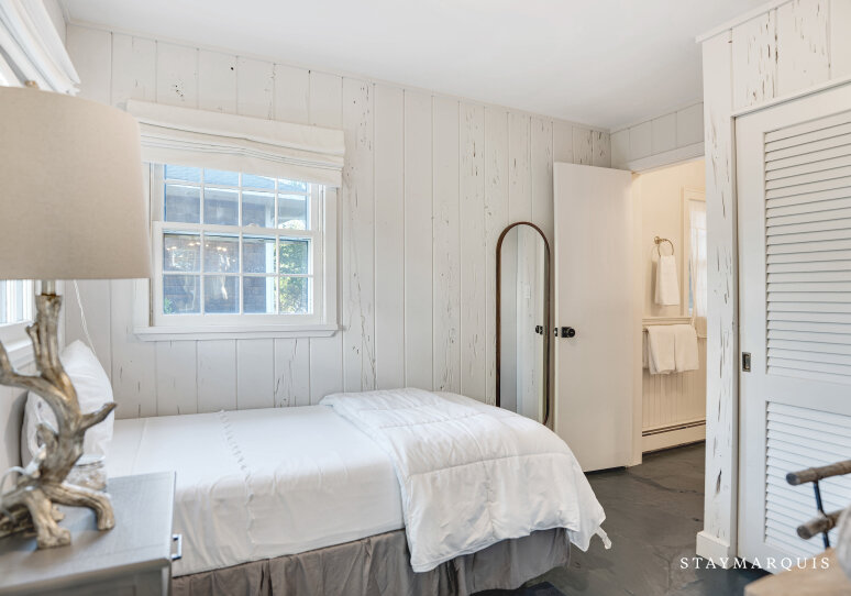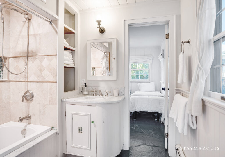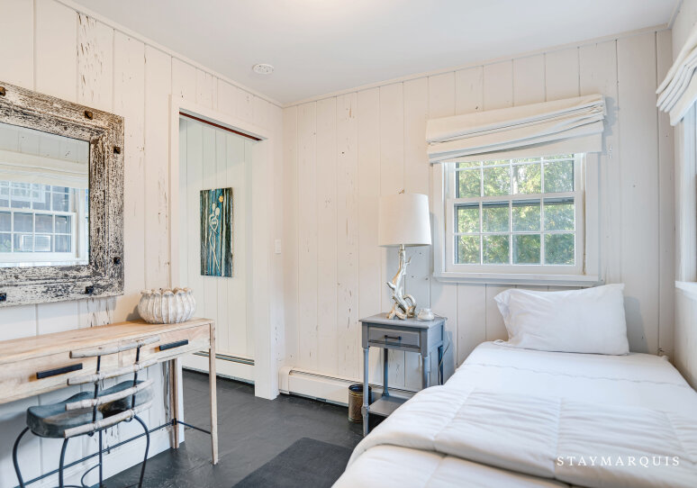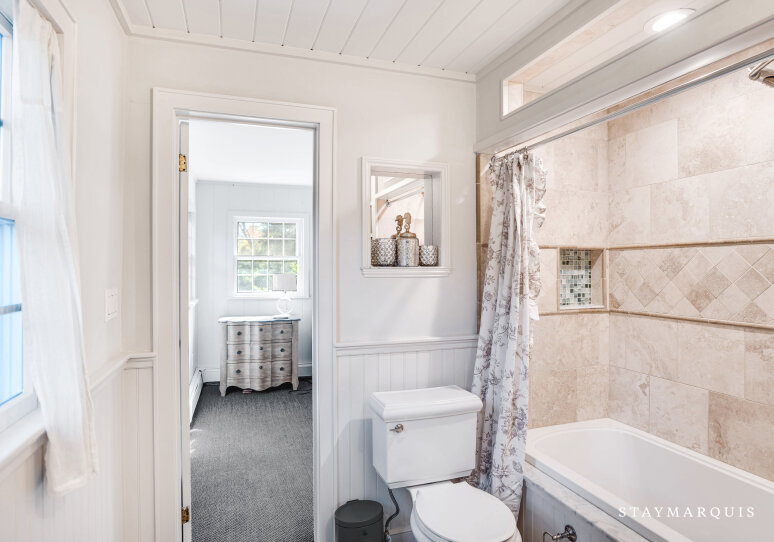 This cottage offers three beautifully designed bedrooms and a single bathroom, arranged with both privacy and versatility in mind. The master bedroom is an elegant retreat: furnished with a king-sized bed, rich wood-paneling details and direct access to the shared bath via a jack-and-jill door. The two guest bedrooms are equally inviting — one hosts a queen bed and soothing décor, while the third features a twin bed plus a desk, making it ideal for younger guests, a writer’s nook or remote working. The bathroom is the shared full bath with a tub/shower combo, easily accessible from all rooms while still offering the privacy and functionality guests appreciate. Soft linens, thoughtful lighting and fresh coastal accents complete the comfort in each sleeping space, ensuring restful nights after days in the sun.
