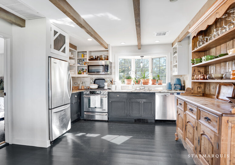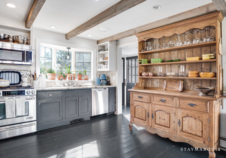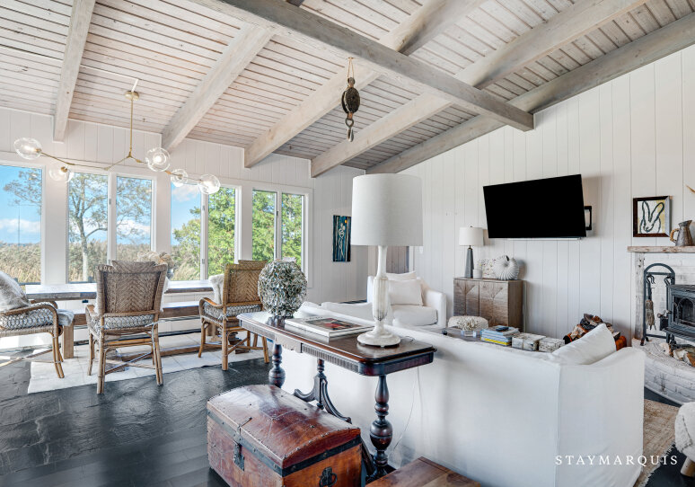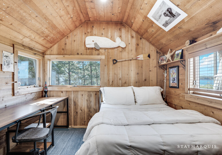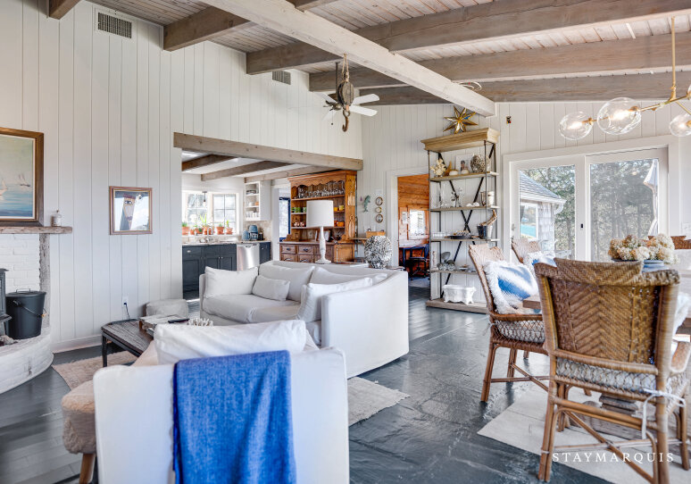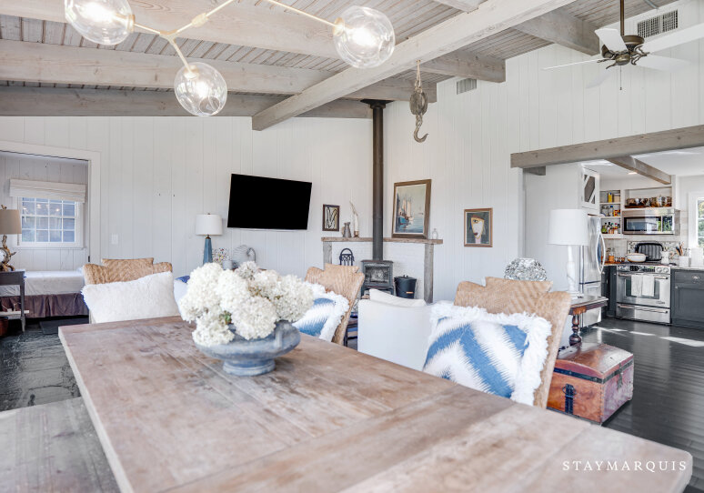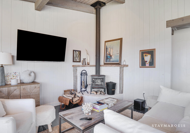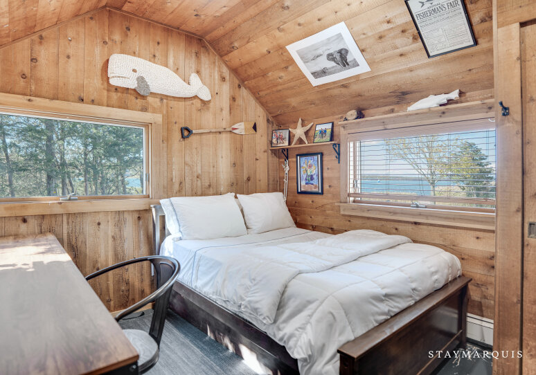 Inside, the home welcomes you with an open-floor plan designed for ease and elegance. A wall of windows spans the common areas, flooding the space with natural light and offering uninterrupted views of the harbor, making the interior and exterior one continuous experience. The wood-paneled walls and ceilings lend warmth and character; artfully curated furnishings and original artwork elevate the ambience beyond typical rental fare, giving a sense of a thoughtfully appointed home rather than a generic property. At the heart lies a chic wood-stove in the living room — perfect for cooler evenings when you’ll curl up with a book or open a bottle and toast marshmallows by the fire. The adjacent kitchen is fully equipped with premium appliances, complete arsenal of pots, pans and dishes, and everything you need to cook effortlessly — from casual grab-and-go breakfasts to gourmet seaside dinners. Off the main living area is a dedicated office space with desk and high-speed WiFi, so whether you’re responding to a quick email or simply planning tomorrow’s outing, this space works beautifully. Modern comforts abound: central AC, washer/dryer, and the thoughtful touches that let you stay connected and comfortable while fully immersed in coastal relaxation.