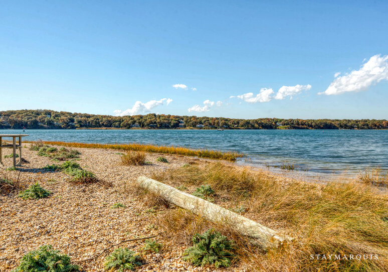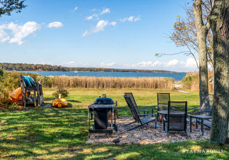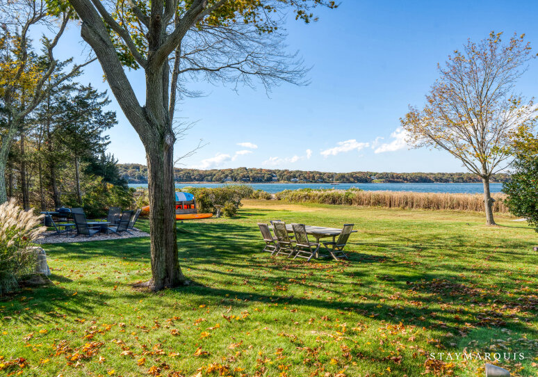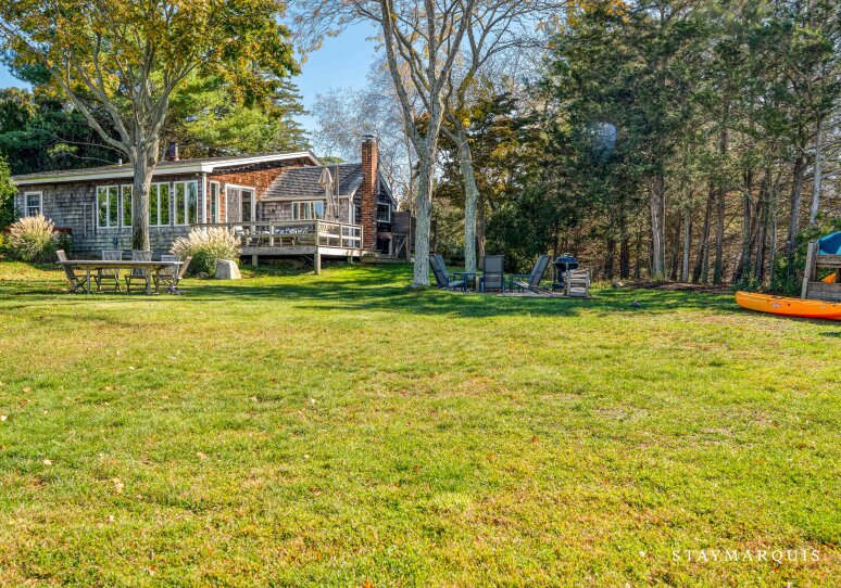 Step outside and let your vacation begin. The cottage sits directly on peaceful three-mile-harbor waters, offering a private stretch of sand where mornings begin with birdsong and the water’s edge invites barefoot wanderings. From the shoreline you’ll spot the kayaks ready for use — glide over glassy water surfaces, discover hidden corners of the harbor, and drift into the day. Back on land, the outdoor deck provides an elegant lounging zone: move easily from comfortable sofas overlooking the sunset, to an alfresco dining table set for long lunches or candle-lit dinners, to the charcoal grill for casual seaside cook-outs. Nearby, a firepit invites you to gather after dark, sip something good, feel the gentle harbor breeze, and watch stars come alive overhead. In every direction you’ll sense vacation: green space gently rolling to the water, full access to water-based recreation, a hot-tub waiting for moonlit soakings — all creating the resort-feel without leaving home. Parking and arrival are seamless so you’ll move right into relaxation.