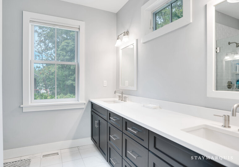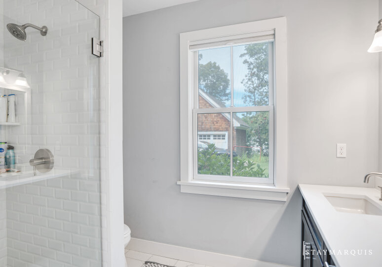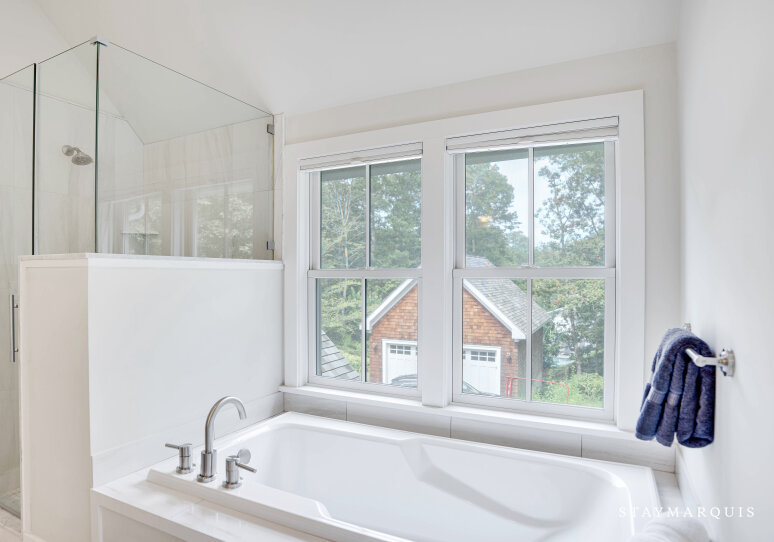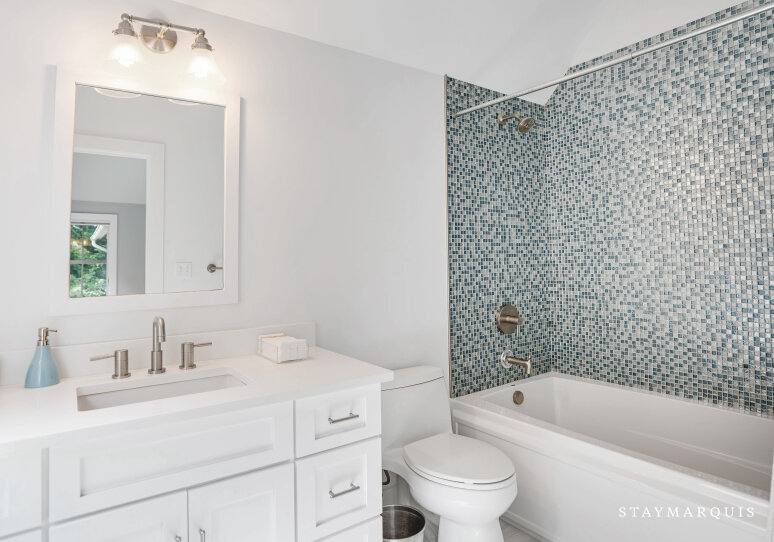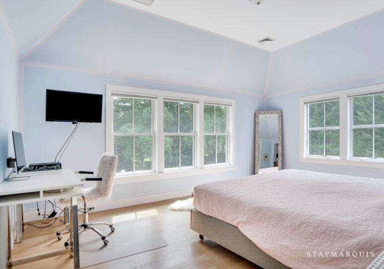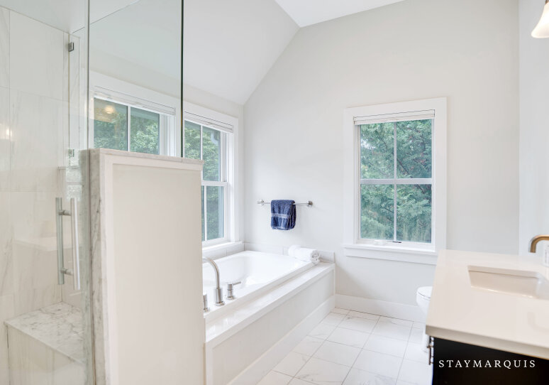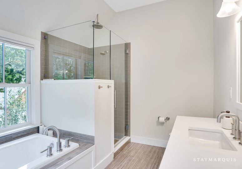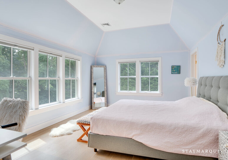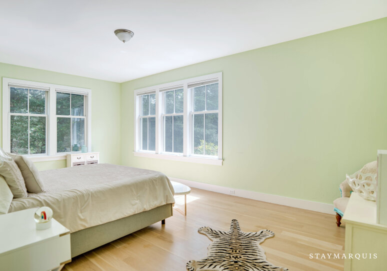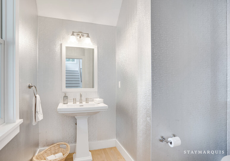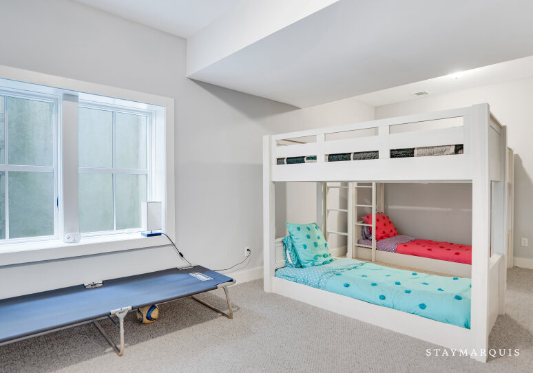 The six bedrooms and five and a half bathrooms are thoughtfully designed to provide the ultimate in rest and rejuvenation. Calming, light-filled, and furnished with fresh linens, each space feels like its own private retreat. The spacious primary suite, located on the second floor, features a queen bed and a spa-inspired ensuite bathroom with a walk-in shower and soaking tub, offering the perfect place to unwind in style. Also upstairs, a guest suite with a queen bed and private ensuite bath ensures both comfort and convenience. On the main level, two additional bedrooms each feature queen beds and ensuite bathrooms, ideal for guests seeking easy access without stairs. On the lower level, one bedroom with a queen bed and another with two bunk beds share an adjacent hall bathroom, creating an ideal setup for children, teens, or extra guests. An additional powder room on the main level adds a touch of practicality.