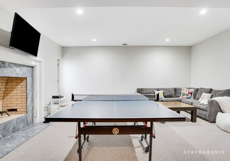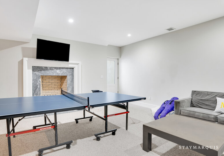 Inside, the home welcomes guests with an open floor plan designed for effortless flow between the kitchen, living room, and dining areas. Sunlight streams through oversized windows and glass doors, creating a bright, airy atmosphere that enhances the home’s modern yet inviting aesthetic. The main living room offers a cozy retreat with a plush sofa, fireplace, and flat-screen television—perfect for movie nights or quiet afternoons. At the heart of the home, a chef’s kitchen is fully equipped with top-of-the-line appliances, cookware, dishes, and everything needed to prepare meals with ease. Large counters and ample seating invite family and friends to gather around as meals come to life. For entertainment, the finished lower level offers a secondary living space complete with its own fireplace, television, and a ping pong table—ideal for both adults and kids. With Wi-Fi, air conditioning, and laundry facilities, every modern comfort is at hand, ensuring a seamless and stress-free stay.