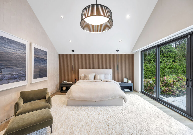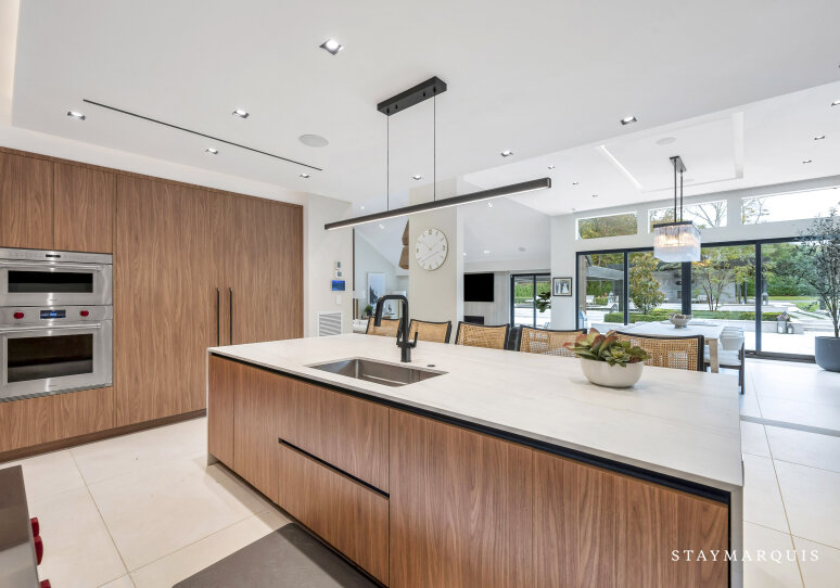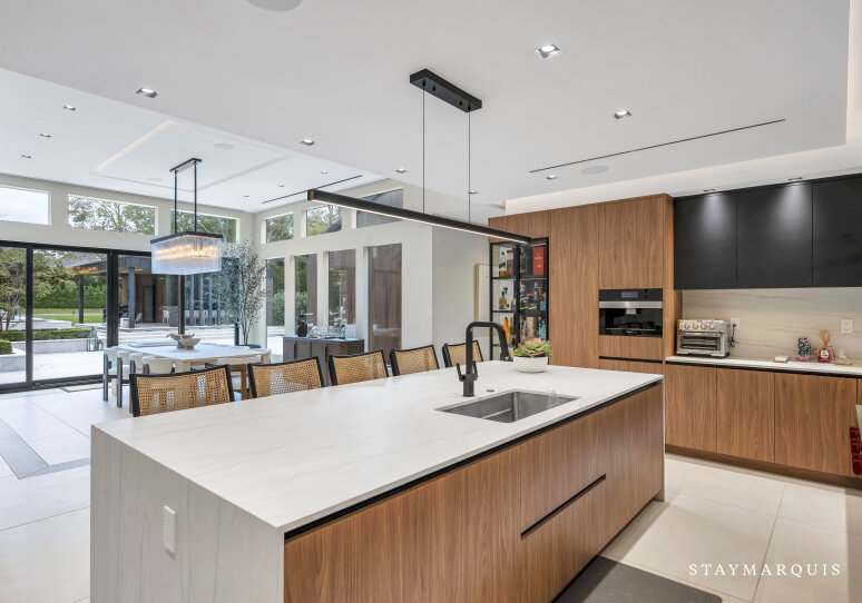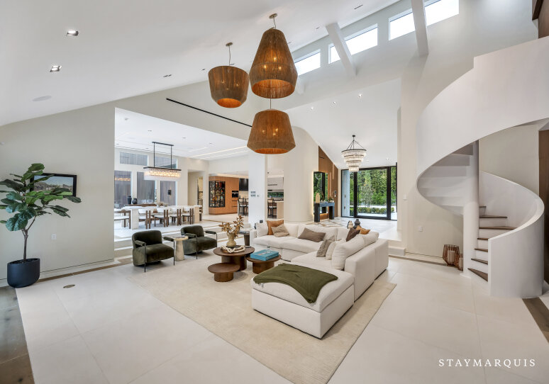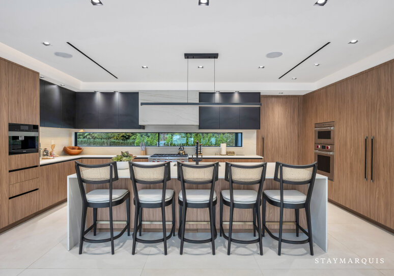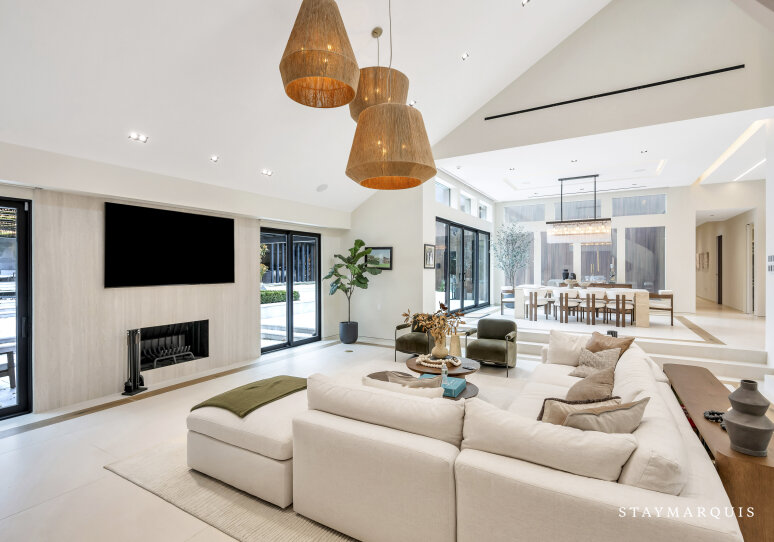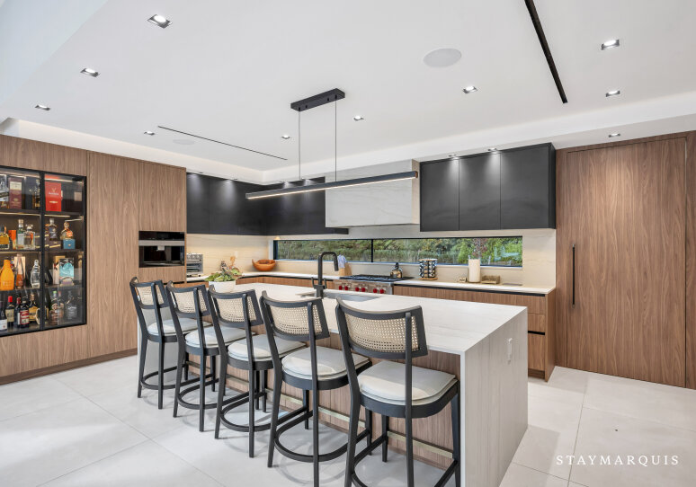 Inside, the home’s interiors are equally captivating—bright, modern, and designed to inspire both relaxation and connection. The open floor plan effortlessly flows from one space to another, creating a sense of expansiveness and ease. The formal living room, anchored by a sleek fireplace and framed by floor-to-ceiling glass doors, opens directly to the deck, creating a true indoor-outdoor living experience. Plush seating and curated art pieces add warmth and personality, while natural light floods the space through oversized windows. The chef’s kitchen is a centerpiece of the home, boasting premium appliances, stone countertops, and a generous island perfect for casual dining or entertaining. Adjacent, the dining area comfortably accommodates large gatherings, while additional sitting areas offer quiet spaces to unwind.