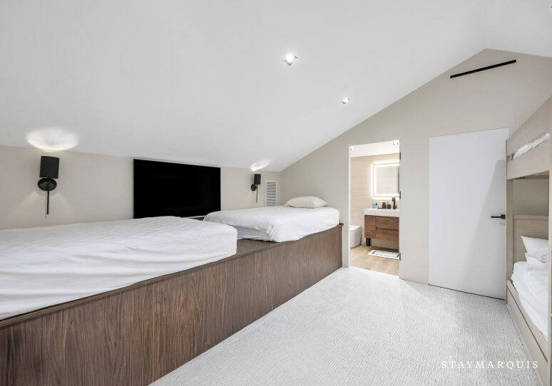 The bedrooms have been designed as private sanctuaries, offering comfort and tranquility after a day spent outdoors. The spacious primary suite, located on the main level, features a king bed, private deck access, and a spa-like ensuite bathroom complete with a soaking tub and rain shower. Bedrooms two, three, and four—also located on the main level—each offer queen beds, serene décor, and soft, luxurious linens. Bedrooms two and three share a stylish Jack and Jill bathroom, while bedroom four enjoys a private ensuite. Upstairs, bedroom five serves as an inviting retreat for children or guests, featuring two built-in bunk beds and two full beds with its own ensuite bath. Each room is thoughtfully appointed with calming color palettes, plush bedding, and curated furnishings, ensuring every guest experiences the same level of comfort and style.