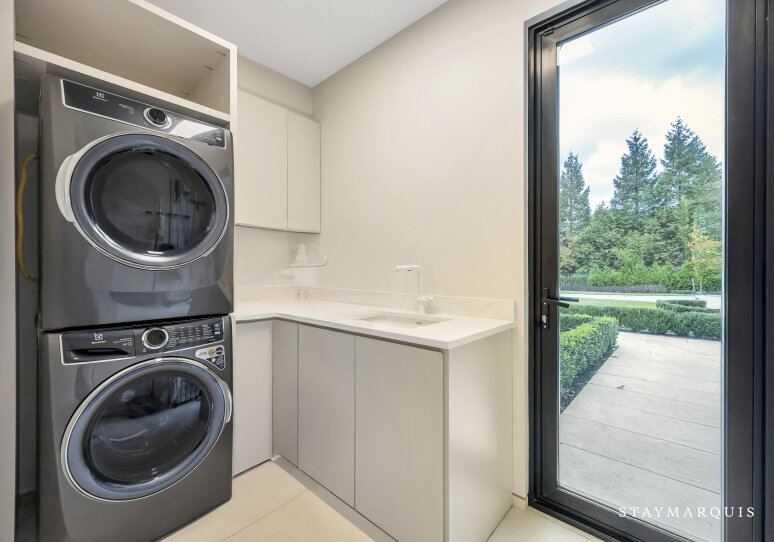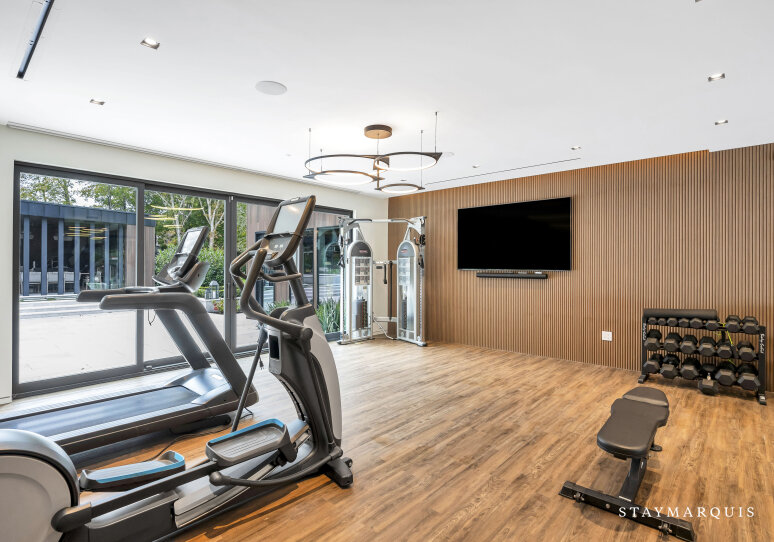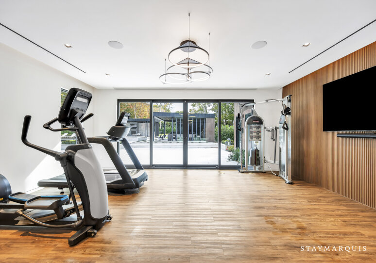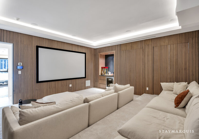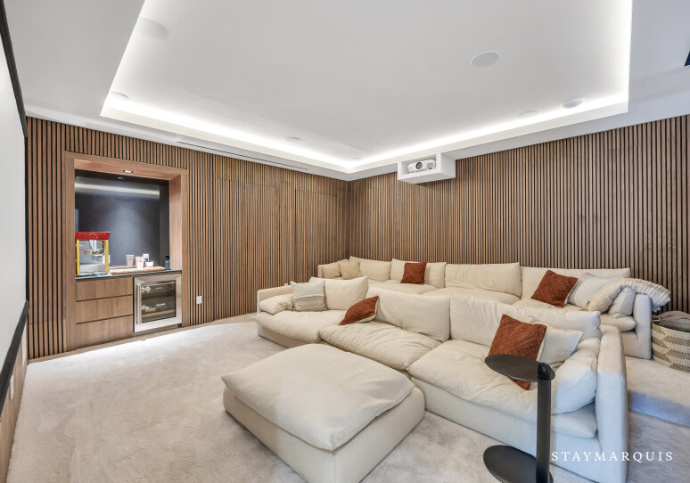 For entertainment, the home includes a private movie theater featuring a large projection screen and comfortable tiered seating—a perfect setting for family movie nights. A private gym outfitted with top-of-the-line equipment ensures guests can maintain their wellness routines without leaving the property. Every space in the home reflects attention to detail, from the curated furnishings and art to the sophisticated lighting and modern finishes. With central air conditioning, a washer and dryer, and dedicated workspace, the home offers every modern convenience.