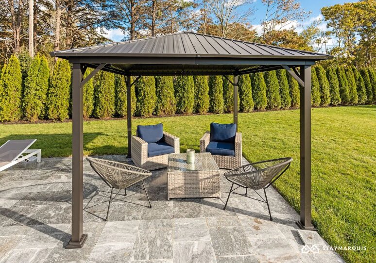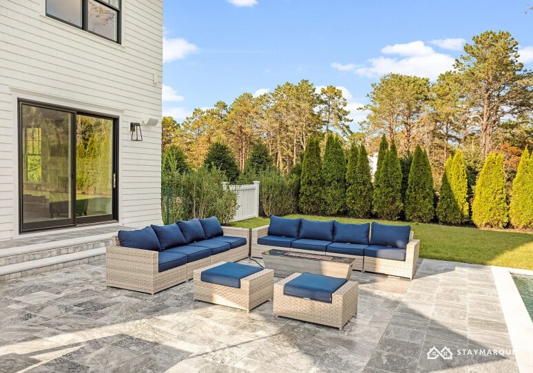7BR/8BA - fitness studio, sauna, vast outdoor space complete with stone patio, cushioned furniture, and privacy hedges