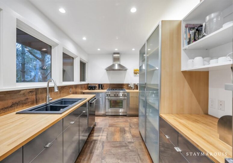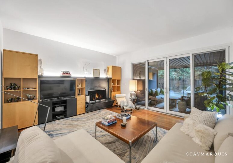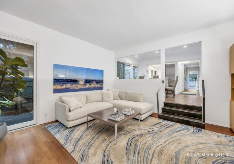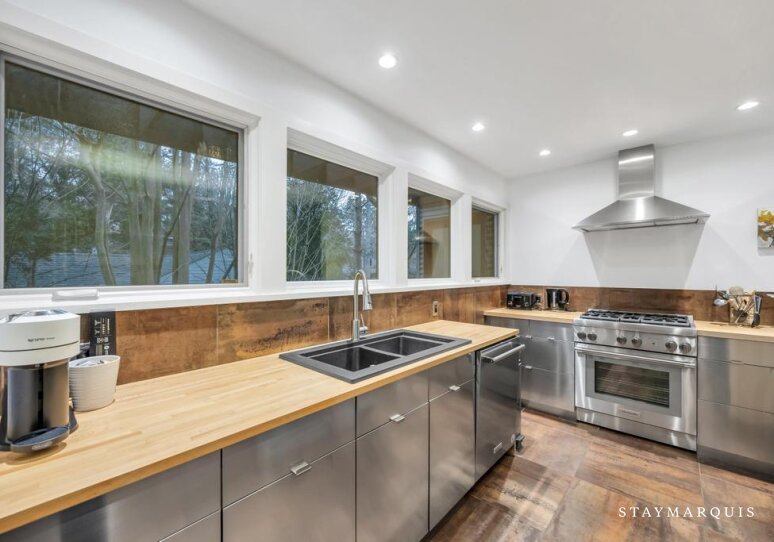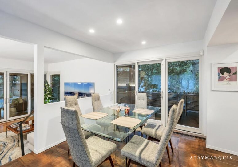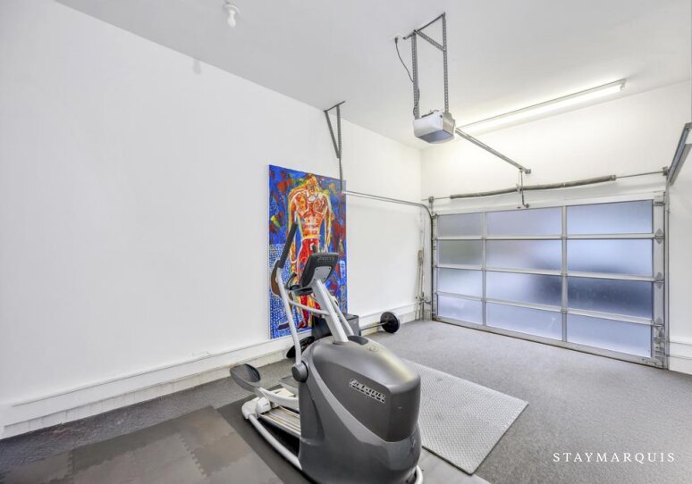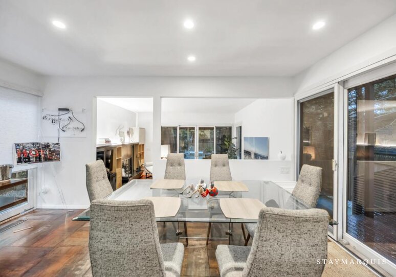 Inside, the home welcomes guests with a bright, open layout filled with natural light. The living spaces flow seamlessly from the living room to the dining area and into the gourmet kitchen, creating an inviting environment where everyone can stay connected. The kitchen is beautifully equipped with top-of-the-line appliances, ample counter space, and a Nespresso coffee maker, making everything from quick breakfasts to leisurely dinners a pleasure. Stylish yet comfortable furnishings set the tone throughout the home, balancing modern design with warmth and livability. Guests will appreciate everyday conveniences such as high-speed WiFi, central air conditioning, and a washer and dryer, ensuring a seamless stay. For those blending work and leisure, the laptop-friendly workspace offers a quiet, functional area to stay productive, while the fitness room allows guests to maintain their routines without leaving home. Sonos sound enhances the experience, setting the mood whether entertaining or unwinding.