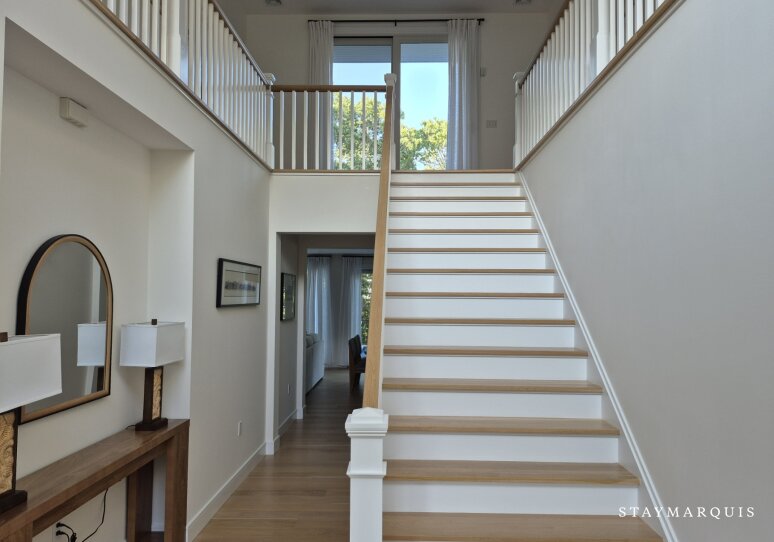 Inside, the home flows seamlessly from one space to the next, offering an airy, open layout filled with natural light. The living room, dining area, and gourmet kitchen connect effortlessly, creating an ideal environment for gathering and entertaining. The kitchen is equipped with top-of-the-line appliances, a coffee maker for slow mornings, and everything needed to prepare memorable meals. Whether hosting a dinner or enjoying a casual breakfast, the space is both functional and elegant. Upstairs, a dedicated lounge and office area provides a quiet retreat for remote work, complete with a printer for added convenience. Modern conveniences such as high-speed WiFi, central air conditioning, and an in-home washer and dryer ensure a comfortable and stress-free stay. Every detail has been curated to balance luxury with livability.