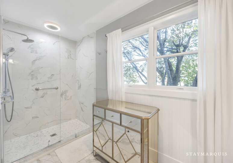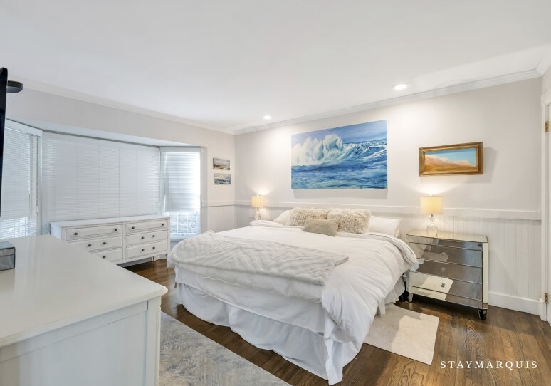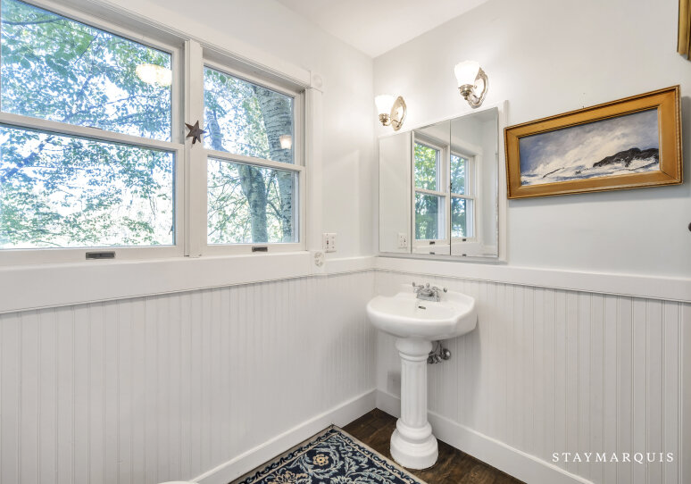 The sleeping quarters are designed for relaxation and privacy. The primary bedroom on the main floor features a luxurious ensuite bath, while three additional guest bedrooms on the second floor each include their own private bathrooms. A convenient powder room on the main floor serves guests and complements the thoughtful layout. Each space is furnished with comfort and style in mind, ensuring restful nights and rejuvenating mornings throughout your stay.