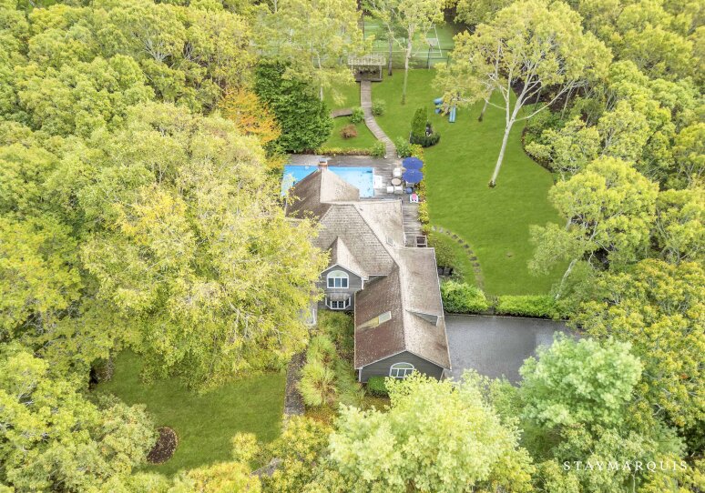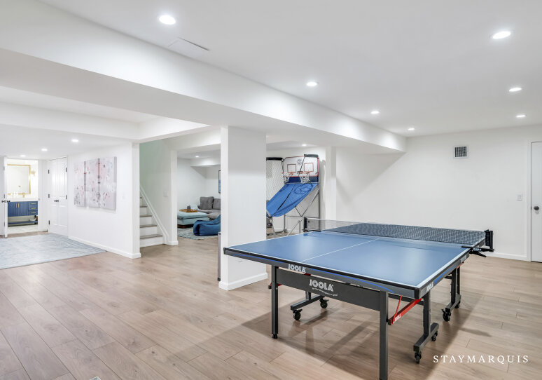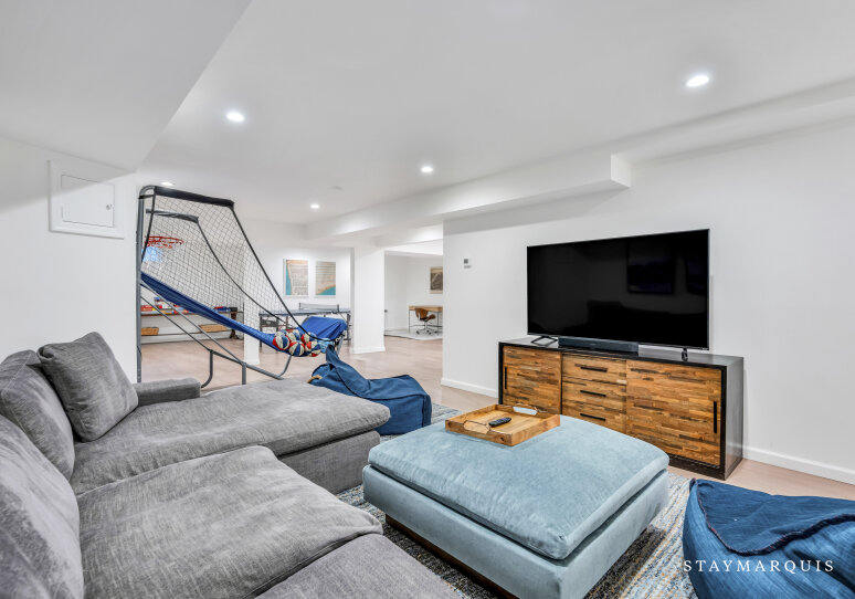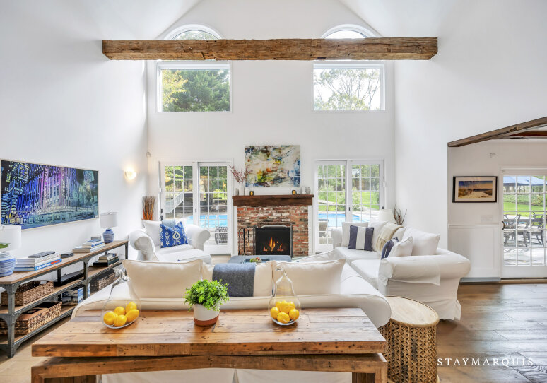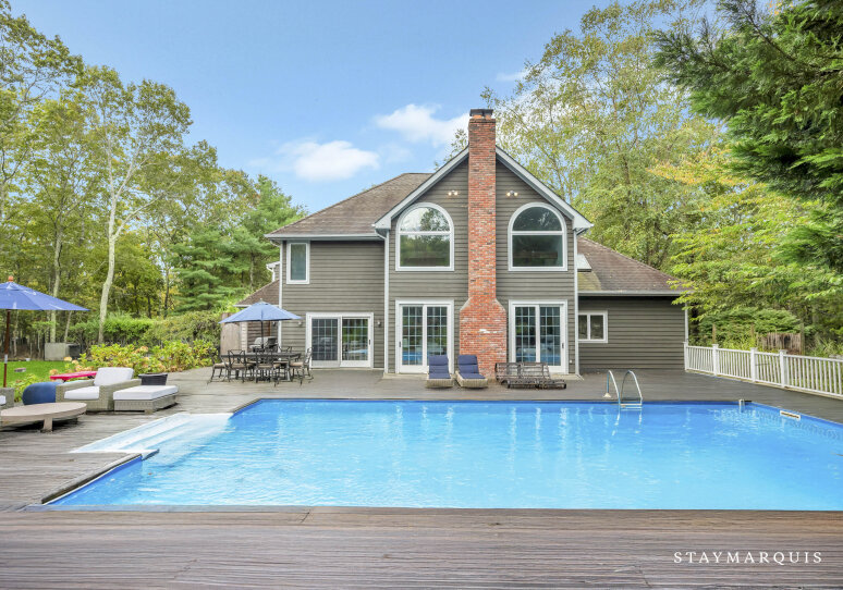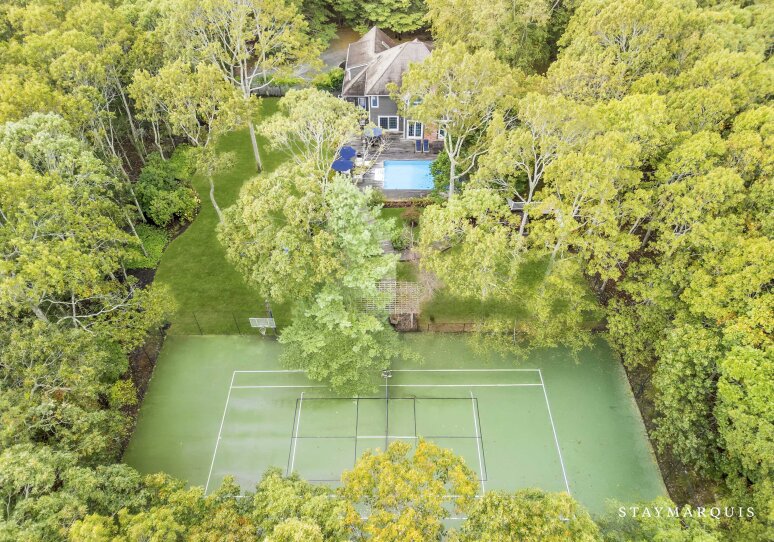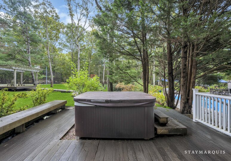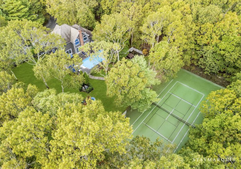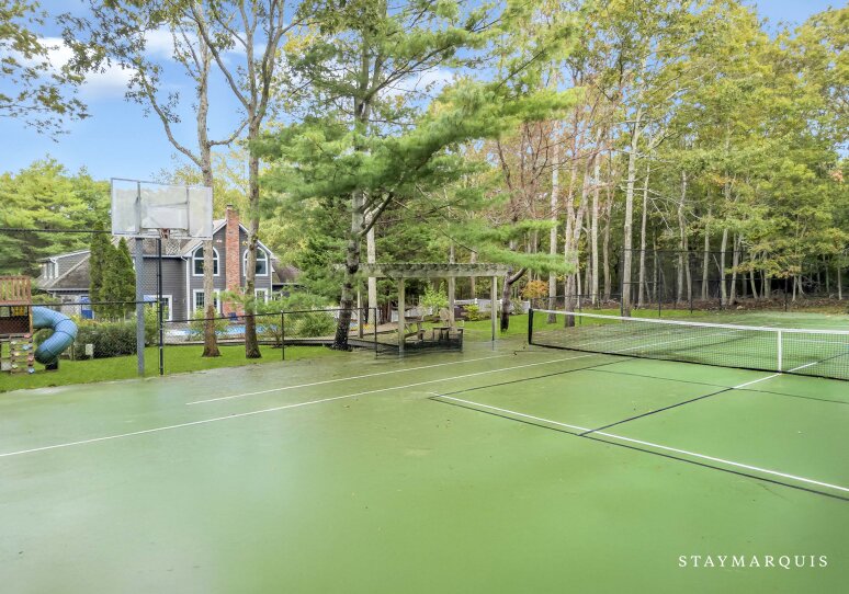 Spacious home with new high-end renovations and furnishings. Four large bedrooms (each with ensuite bath), fully stocked designer kitchen with high-end appliances, and a brand new finished basement with ping-pong, home theater, children’s play area and a bonus room. The house leads out to a mahogany deck with a large heated saltwater swimming pool, new Hot Tub (not pictured), Restoration Hardware table and loungers, brand new 5-burner Weber grill and outdoor shower. Play a game of corn hole in the backyard or walk down the pathway on 4 acres to find your private tennis court and basketball court. Young children are not left out of the outdoor fun as there is a large play area with swings (baby and child), slides and a tree house — their own park in the backyard.
