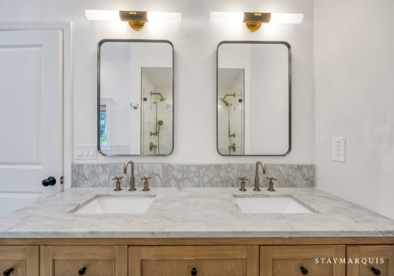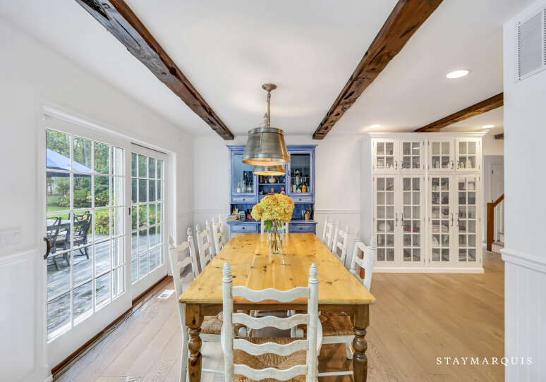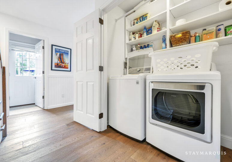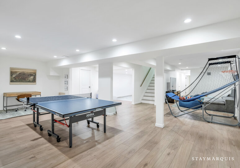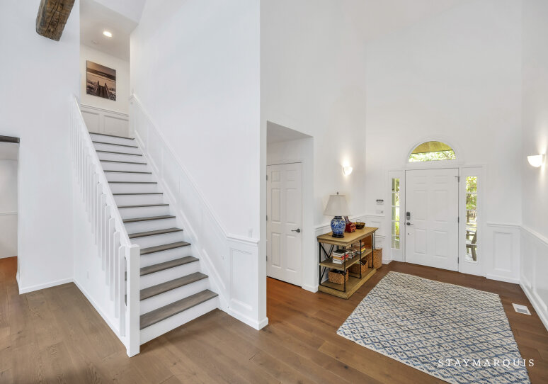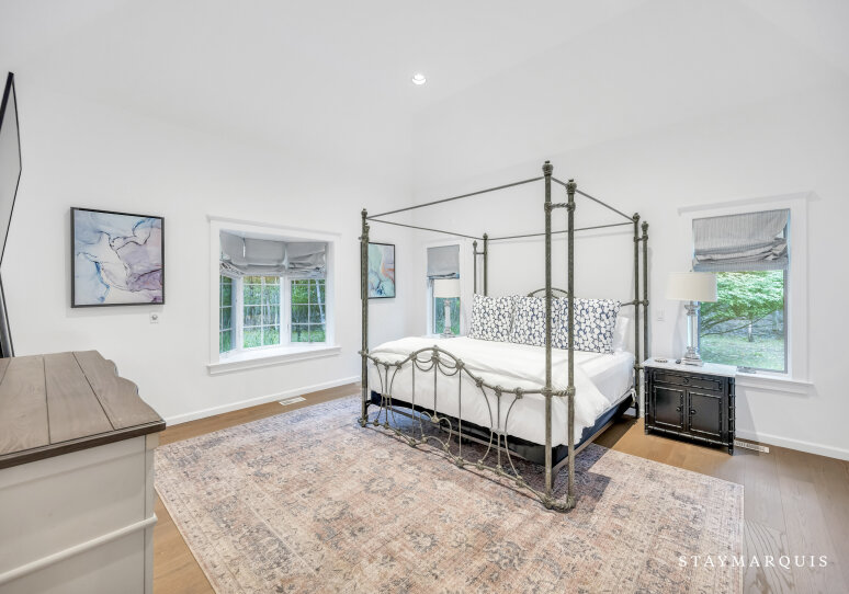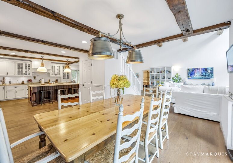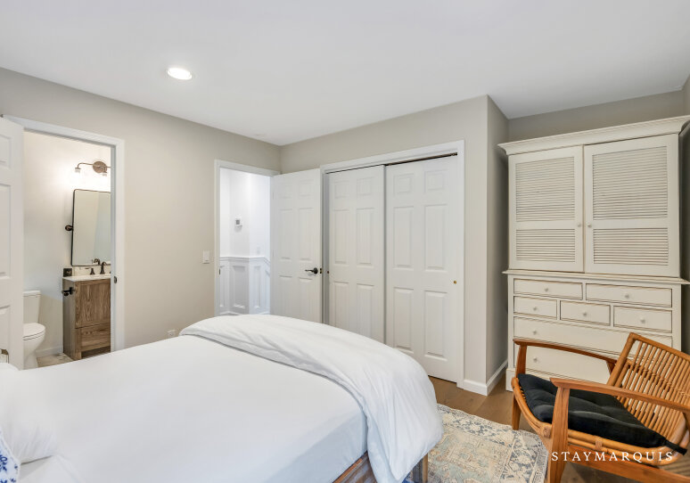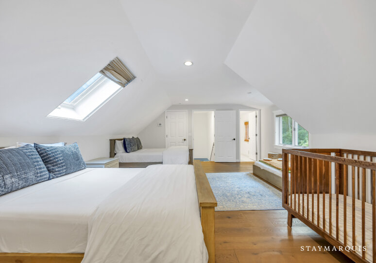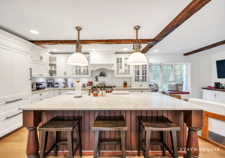 Spacious home with new high-end renovations and furnishings. Four large bedrooms (each with ensuite bath), fully stocked designer kitchen with high-end appliances, and a brand new finished basement with ping-pong, home theater, children’s play area and a bonus room. The house leads out to a mahogany deck with a large heated saltwater swimming pool, new Hot Tub (not pictured), Restoration Hardware table and loungers, brand new 5-burner Weber grill and outdoor shower. Play a game of corn hole in the backyard or walk down the pathway on 4 acres to find your private tennis court and basketball court. Young children are not left out of the outdoor fun as there is a large play area with swings (baby and child), slides and a tree house — their own park in the backyard.