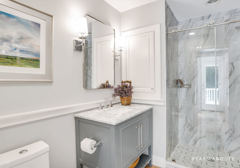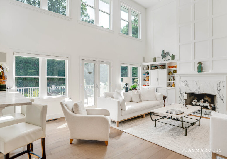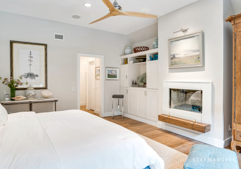 Featuring over 4,500 square feet of living, the southern facing sun-splashed main level delivers flexible living with an open floor plan and distinguishing features including extra high ceilings, wide-plank white oak floors, a gas-burning fireplace, and more. The chic, two-story living room makes for the perfect gathering space. Flowing to the Chef’s kitchen, entertain while you cook as it features premium appliances, Quartzite countertops, and a separate sunny dining area. Multiple pairs of glass doors open to the rear deck, merging indoor and outdoor living. Relax and wind down in one of the five generously sized bedrooms available. The serene Primary suite located on the main level features a gas fireplace, large closet, private balcony access overlooking the pool, and an ensuite marble bath that deserves its very own spa moment with a soaking tub, glass standing shower and dual vanity. Upstairs, there is a private wing with two bedrooms and a relaxing shared bath plus the two remaining bedrooms with a shared bath.
