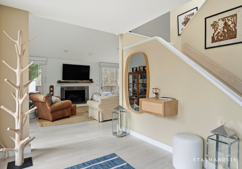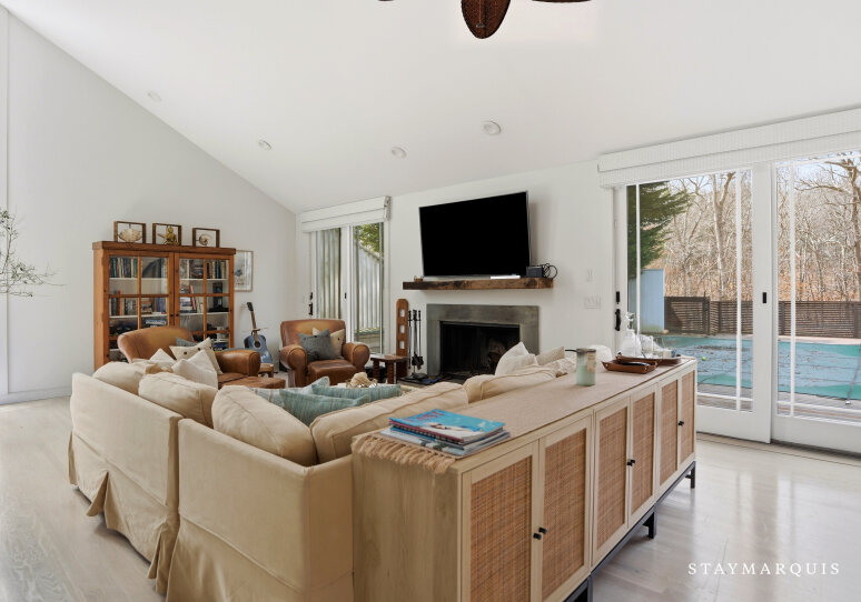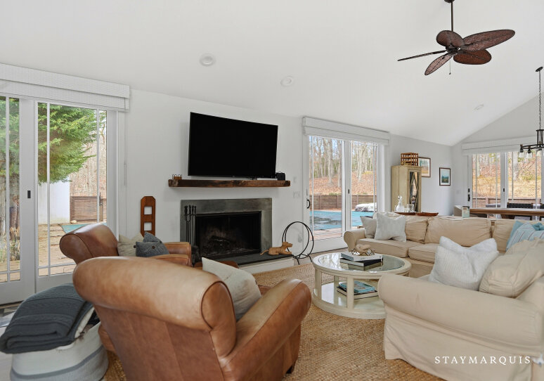 Beautifully renovated four bedroom, two and one-half bath house with all the bells and whistles located on 1.1+/- beautifully landscaped acres abutting a reserve. The great room with wood-burning fireplace and dining area is bright and sunny with glass sliders that open to a lovely yard and expansive pool area. The kitchen and baths are newly renovated, and the second floor master bedroom suite has a private deck and fireplace plus an adjacent open office area, and the whole house is wired for cable, Wi-Fi, and sound. As an added bonus, there is a private bay beach at the end of this wonderful cul-de-sac street. A perfect Hamptons home in immaculate condition.