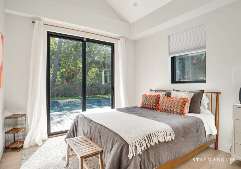 The outdoor amenities of this East Hampton gem are nothing short of spectacular. Total privacy is guaranteed, allowing guests to relax and unwind in complete seclusion. The expansive deck is the centerpiece of the outdoor area, featuring a large dining table where alfresco meals can be enjoyed under the sun or stars. A state-of-the-art gas BBQ makes grilling a breeze, perfect for preparing delicious summer feasts. The heated pool with built in hot tub invites you to take a refreshing dip at any time of day, surrounded by multiple sitting areas that are just right for sipping cocktails or lounging with a good book. The beautifully landscaped yard is expansive, providing plenty of space for outdoor activities or simply soaking up the peaceful surroundings. For those traveling by car, there’s ample free parking, ensuring convenience from the moment you arrive. Every detail of the exterior space has been designed with relaxation and enjoyment in mind, making it the perfect setting for both quiet mornings and lively evenings.