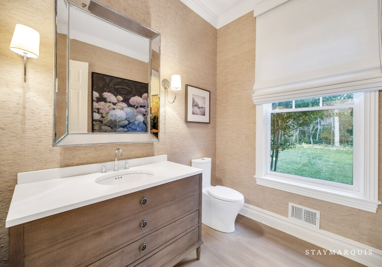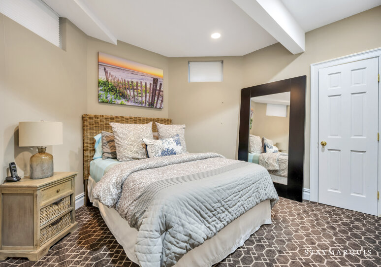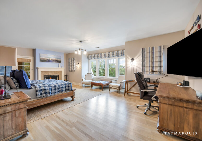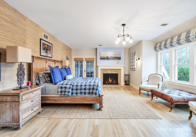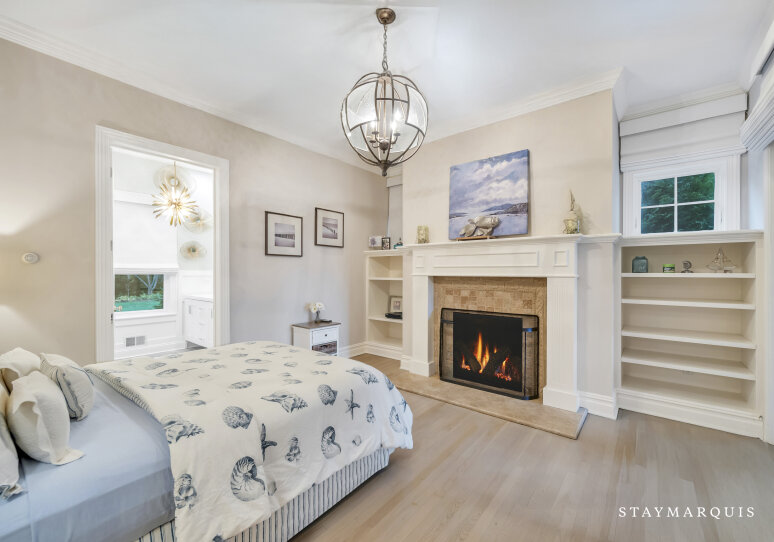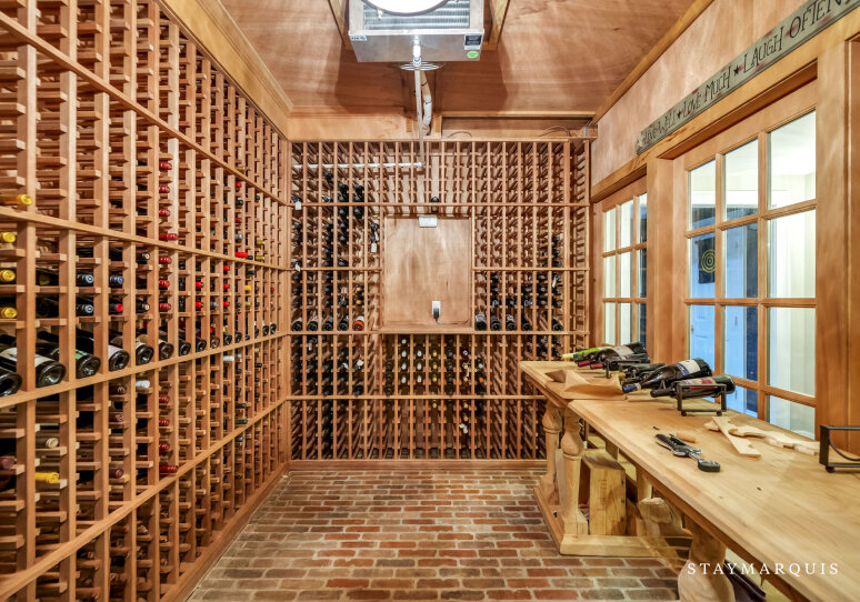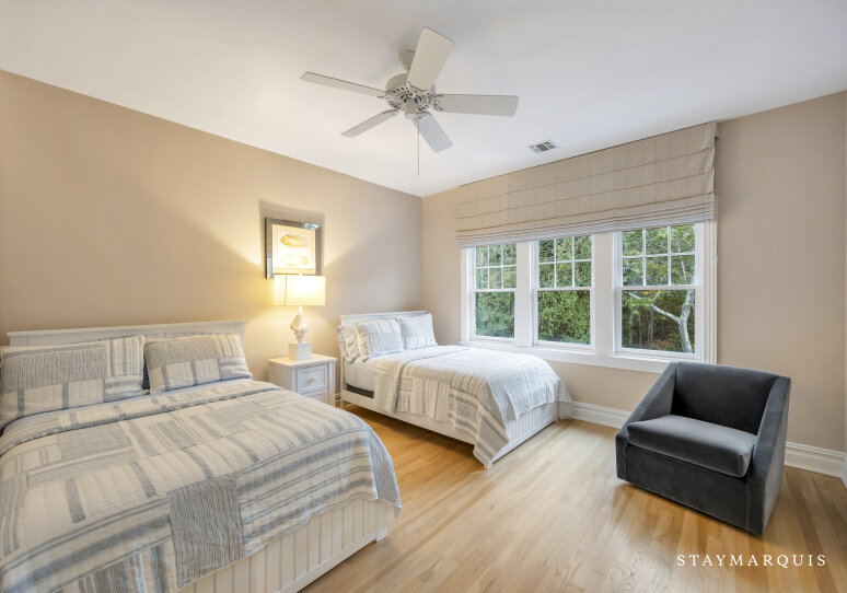 The estate offers 8 generously sized bedrooms, each thoughtfully appointed to provide maximum comfort and privacy. The master suite, located on the second floor, features a king-sized bed, a private balcony overlooking the grounds, and an ensuite bathroom with luxurious finishes. Four additional guest bedrooms on the second level offer ample space and serene views. A guest bedroom on the main level provides convenience and accessibility, while two additional guest bedrooms on the lower level ensure that all guests have a comfortable retreat. The home also includes 7.5 bathrooms, each designed with attention to detail and high-end fixtures.
