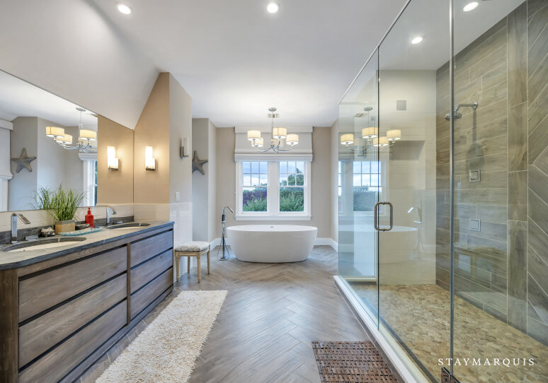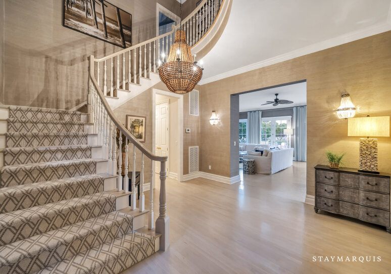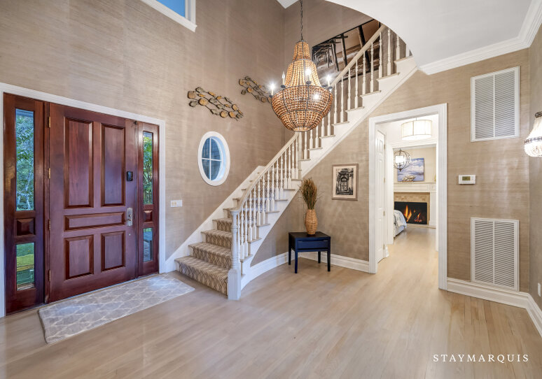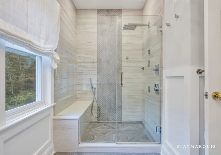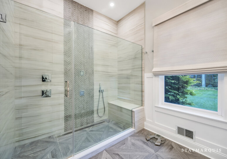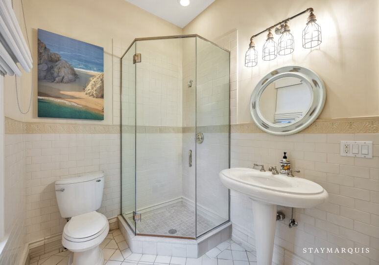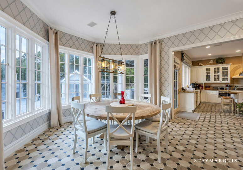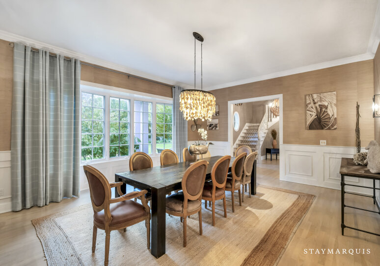 The estate offers 8 generously sized bedrooms, each thoughtfully appointed to provide maximum comfort and privacy. The master suite, located on the second floor, features a king-sized bed, a private balcony overlooking the grounds, and an ensuite bathroom with luxurious finishes. Four additional guest bedrooms on the second level offer ample space and serene views. A guest bedroom on the main level provides convenience and accessibility, while two additional guest bedrooms on the lower level ensure that all guests have a comfortable retreat. The home also includes 7.5 bathrooms, each designed with attention to detail and high-end fixtures.