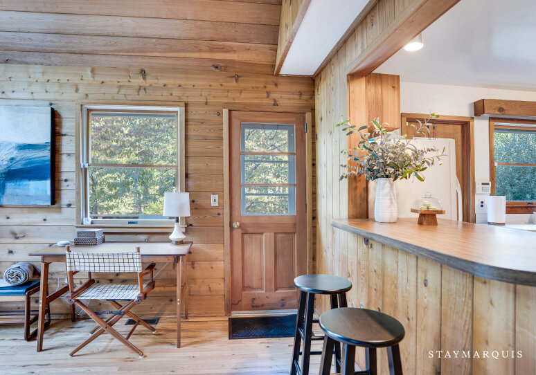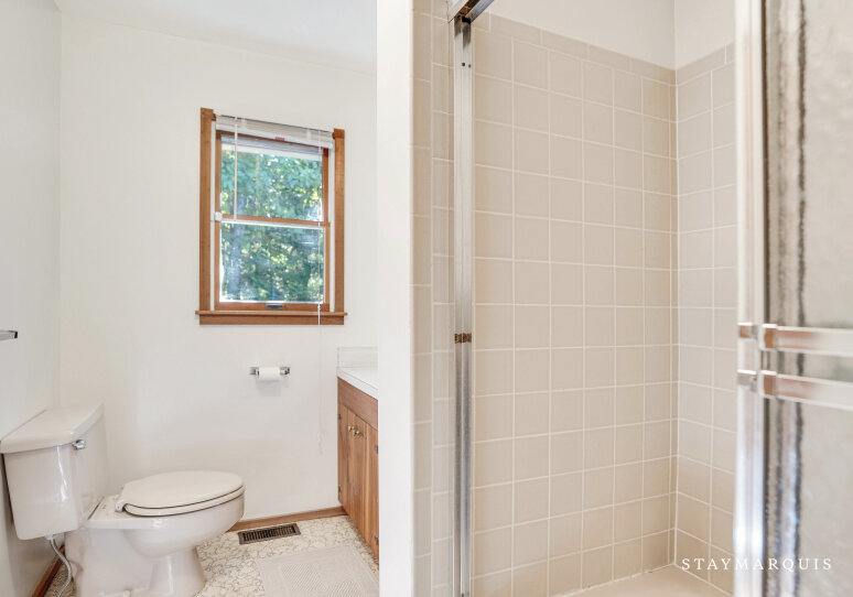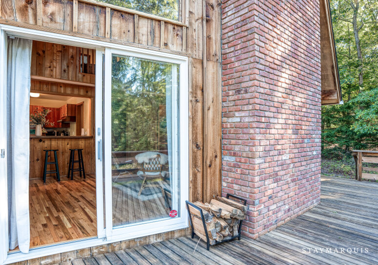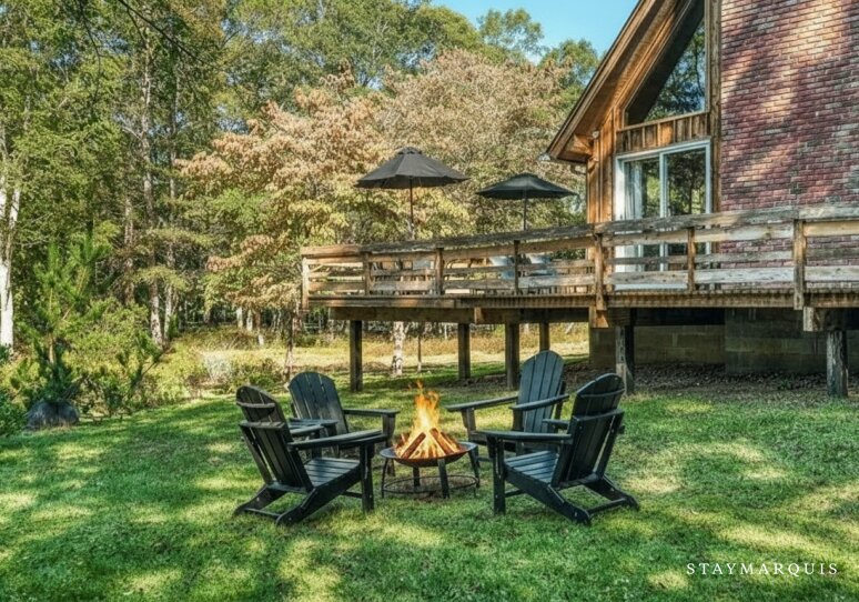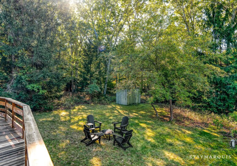 Outside, the home’s natural setting shines. The expansive, tree-lined yard and sunlit deck offer a private oasis for lounging, reading, or socializing. A private driveway provides ample parking, and the home includes Wi-Fi, air conditioning, and a washer/dryer for modern convenience.