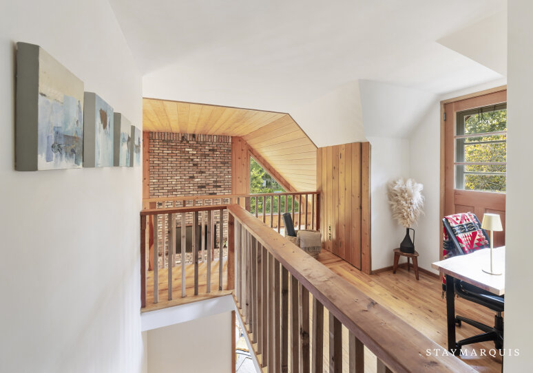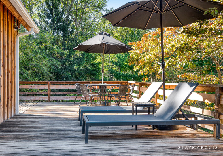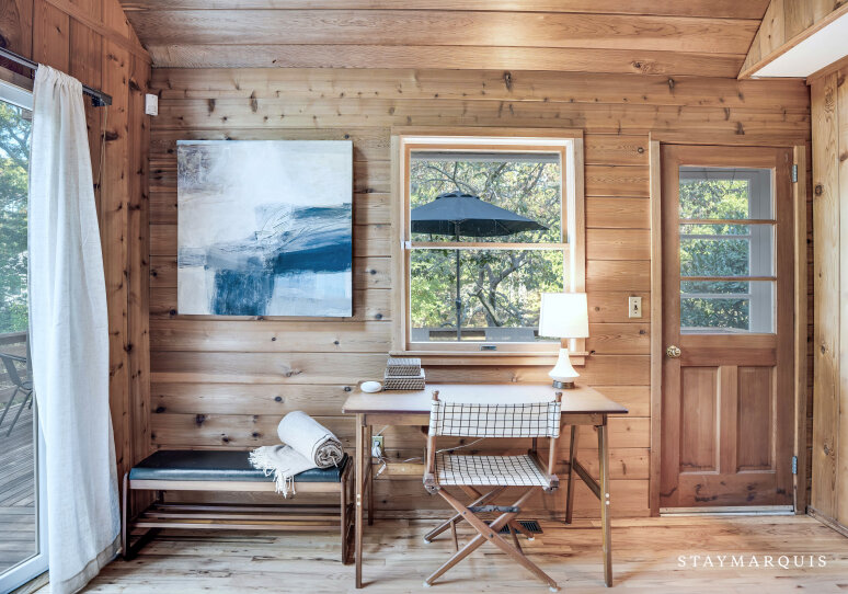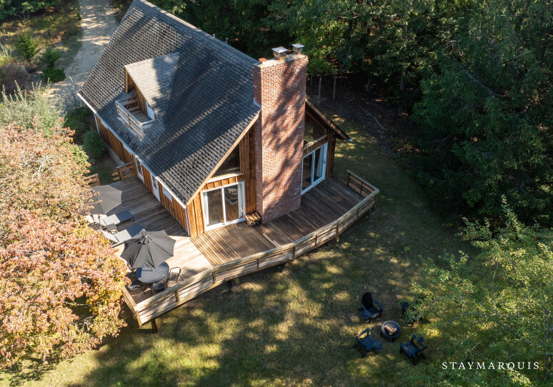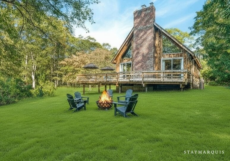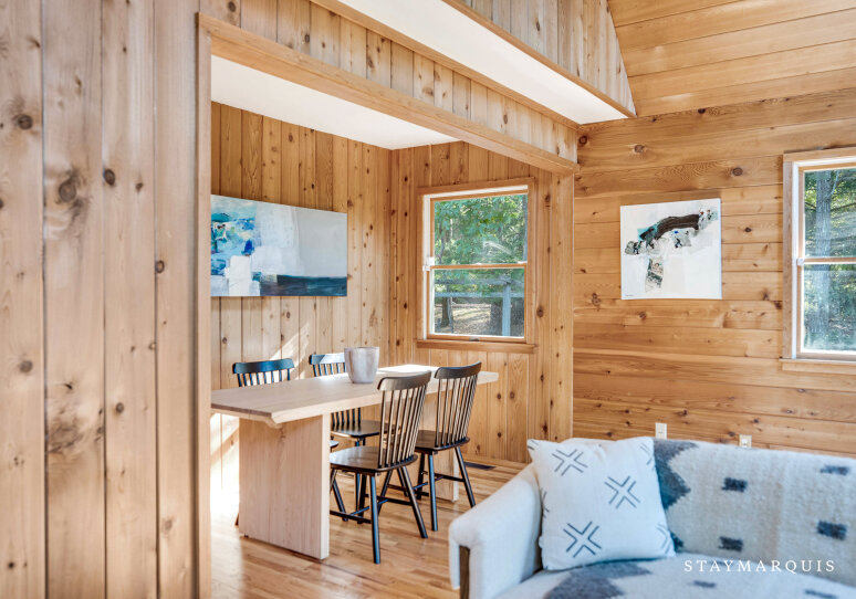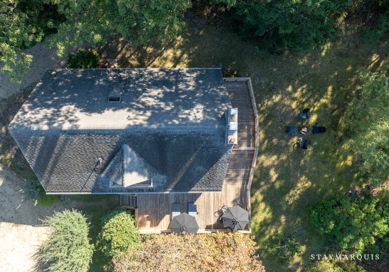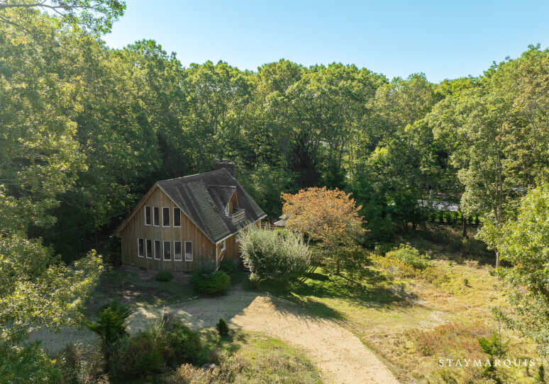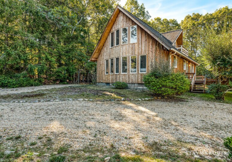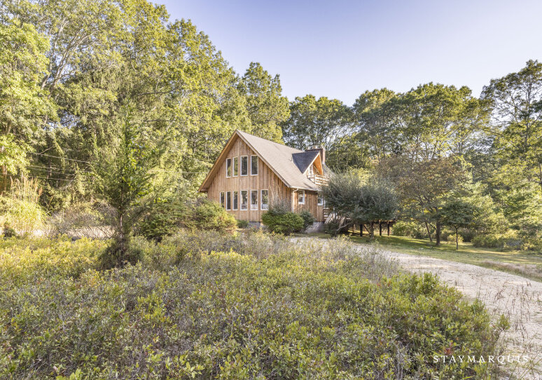 Nestled in the heart of East Hampton, this chic, wood-paneled A-frame home blends cozy cabin charm with modern luxury—an idyllic retreat for those seeking a serene escape surrounded by nature. Just three blocks from Sammy’s Beach and the 116 Preserve, the home is perfectly positioned near one of the area’s most peaceful stretches of sand, offering effortless access to the best of East Hampton’s beaches, trails, and town life. Surrounded by lush greenery, the private yard creates a calm sanctuary where guests can truly unwind. A wooden deck extends seamlessly from the common areas, overlooking the treetops and grounds—perfect for morning coffee, evening cocktails, or simply soaking in the natural surroundings.
