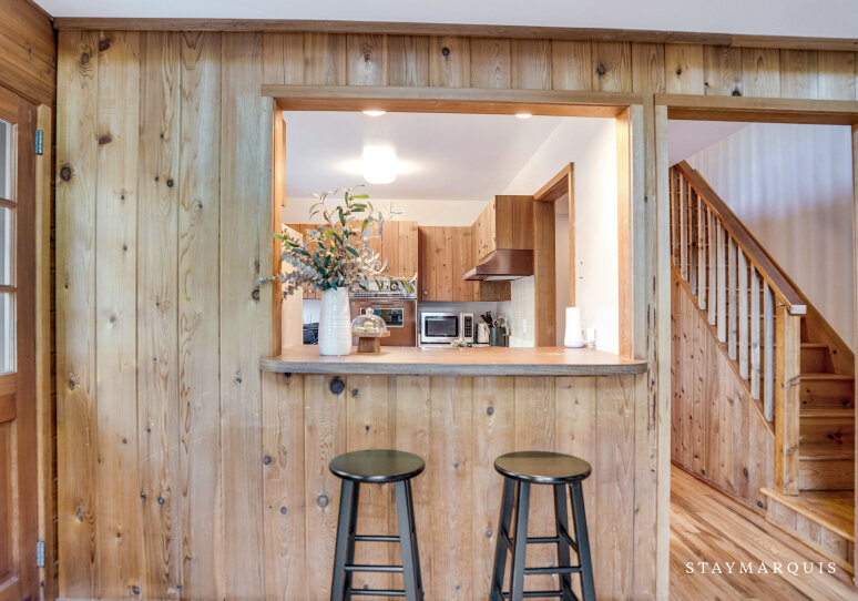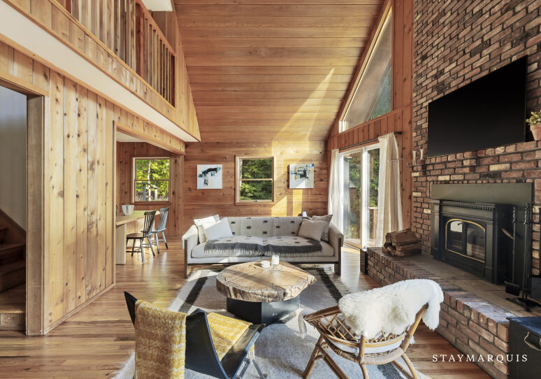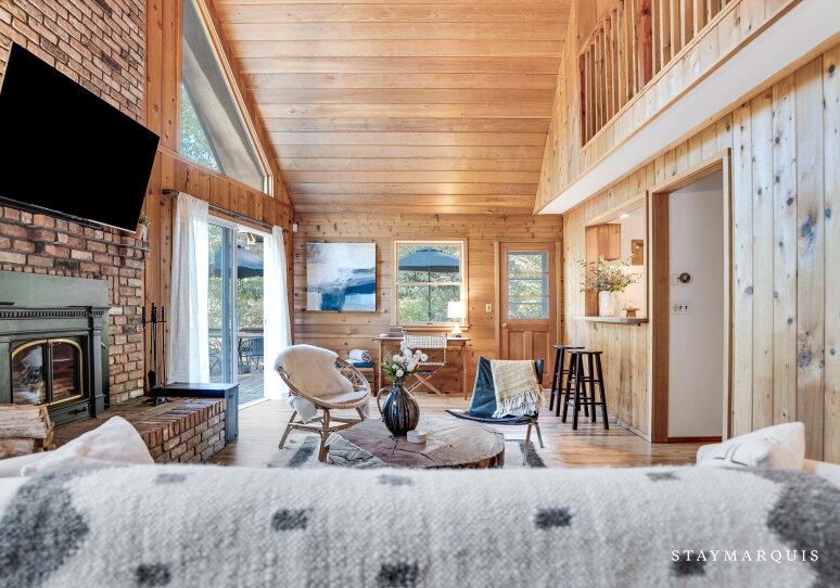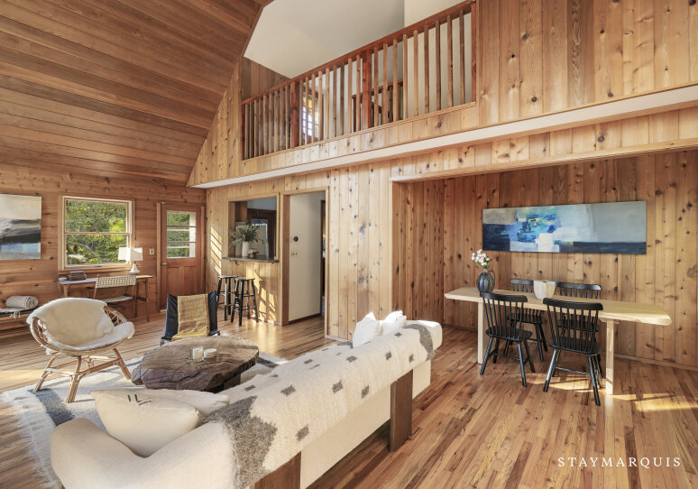 Inside, warm wood-paneled walls and double-height vaulted ceilings create a sense of inviting openness, while large windows fill the space with sunlight and connect the indoors to the outdoors. The open-concept layout flows effortlessly from the living room to the dining area and kitchen. The living room’s plush sofas center around a charming brick fireplace, ideal for cozy evenings after a day at the beach. The adjacent dining area welcomes family meals and conversation, while the fully equipped kitchen features modern appliances and everything needed for effortless entertaining.