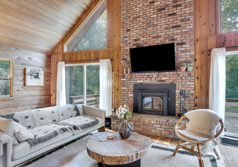 3BR/2BA: Serene setting, wooden deck, brick fireplace, vaulted ceilings with floor to ceiling windows