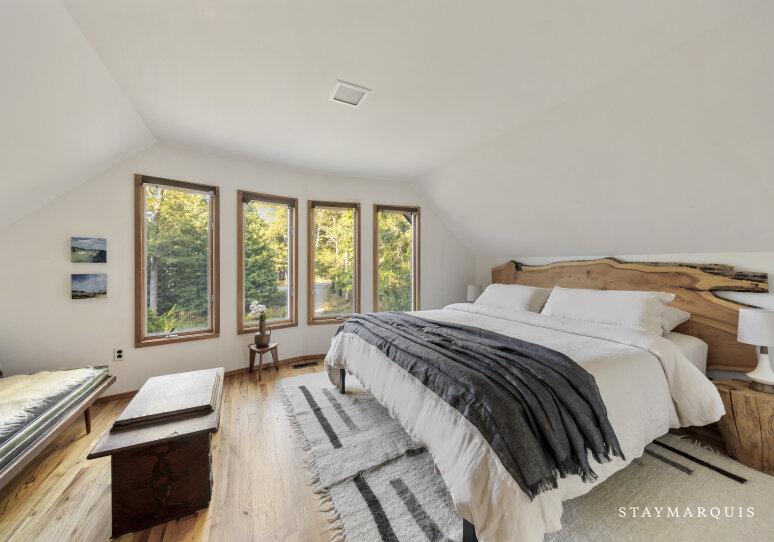 The home’s three bedrooms and two full bathrooms are thoughtfully designed to offer comfort and tranquility. On the main level, one bedroom features a king bed and another a double bed, sharing a beautifully appointed bathroom. Upstairs, the third bedroom provides another king bed and a comfortable sitting area, accompanied by a second full bathroom. Each space feels light, airy, and relaxing—decorated in a chic, coastal-inspired style with fresh linens and calming tones.