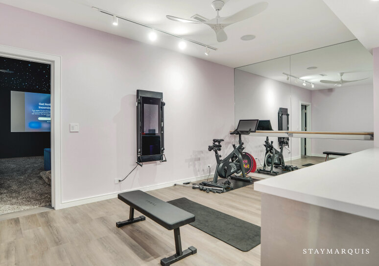 Stepping inside, visitors are guided through a bright, open layout where natural light pours through large windows, illuminating every corner of the home. The main living area offers comfortable seating and effortless flow into the dining space, ideal for lingering meals and conversations. Adjacent is the gourmet kitchen, a culinary haven equipped with top-of-the-line appliances, including a high-end range, wine cooler, ice machine, and a coffee maker to start each morning in effortless style. For added comfort and modern convenience, the home includes a separate office perfect for guests seeking a quiet retreat for work, high-speed Wi-Fi, central air conditioning, and a full washer and dryer. A beautifully designed media room creates a cozy space for movie nights, while the private gym that includes a Soul Cycle bike and Tonal machine offers everything needed for wellness without leaving the house.