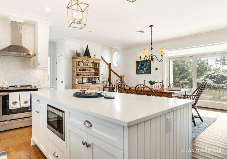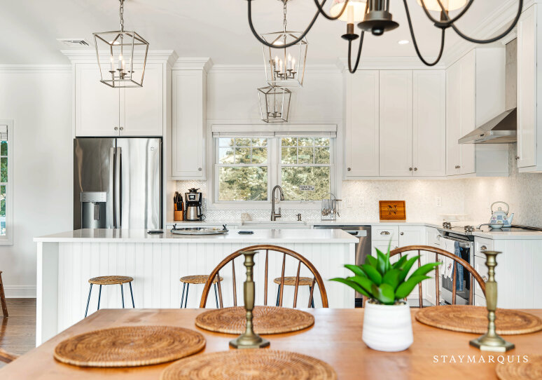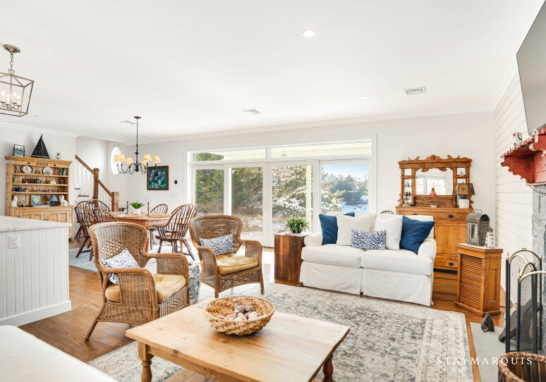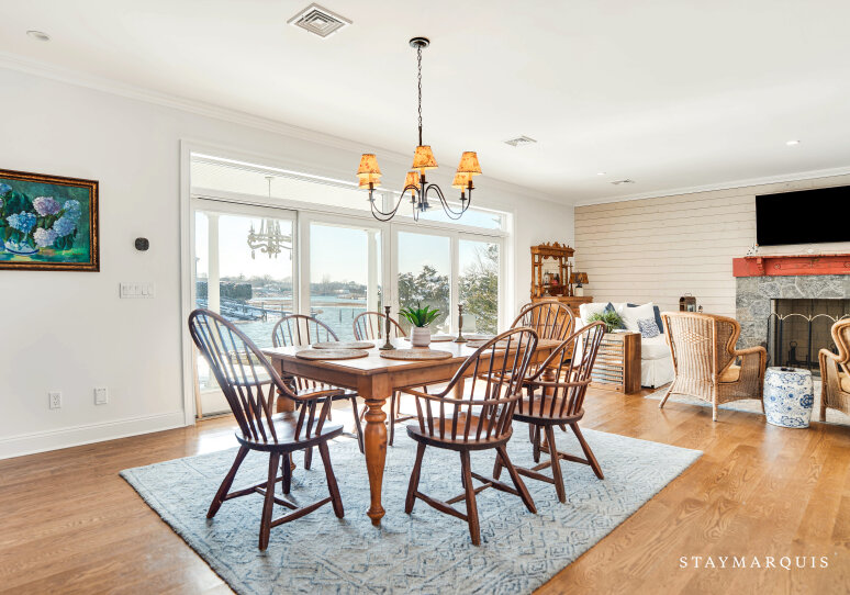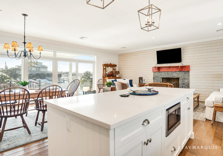 Inside, the home features an open and light-filled layout that flows seamlessly from the living spaces to the dining area and gourmet kitchen. Large windows frame views of the water and flood the home with natural light, creating a bright and welcoming atmosphere. The living room is comfortable and inviting, ideal for gathering with friends or enjoying a quiet evening by the fire. The gourmet kitchen features top-of-the-line appliances, a coffee maker, and ample counter space, making it easy to prepare meals while staying connected to guests in the living and dining areas. Modern conveniences, including WiFi, central air conditioning, and a washer and dryer, ensure a comfortable and carefree stay. Thoughtfully arranged furnishings and stylish décor make every room feel both sophisticated and welcoming, perfectly balancing luxury with homey comfort.