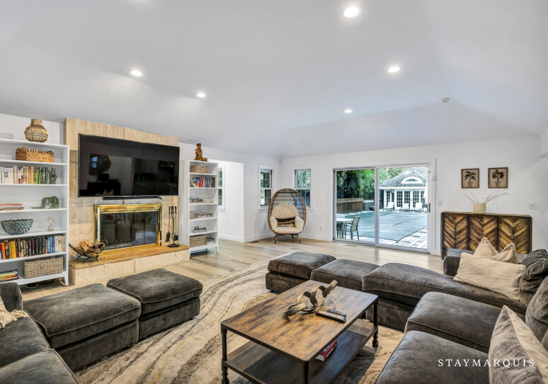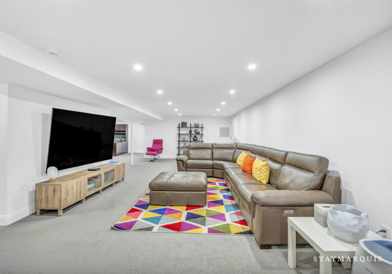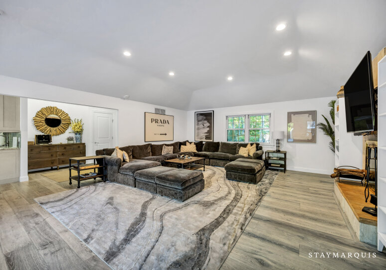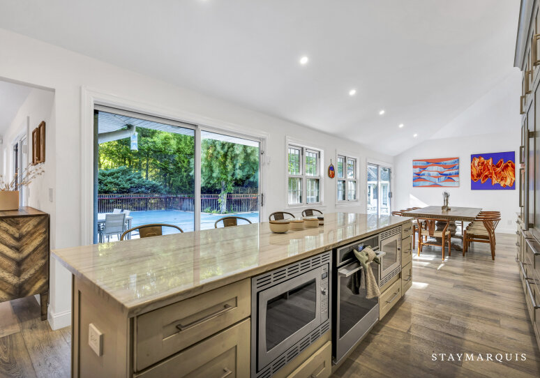 The exterior of this property is nothing short of spectacular. Guests can enjoy total privacy while relaxing on the expansive deck, which boasts an outdoor dining area and a gas BBQ. The deck leads to a heated pool, perfect for refreshing swims, as well as a hot tub, fire table, and private tennis court for endless entertainment. For pickle ball enthusiasts, a portable net is at your disposal for a quick game. A charming pool house and multiple sitting areas provide ideal spots for evening cocktails. The vast yard offers plenty of space for outdoor activities, and ample free parking ensures convenience for all guests.