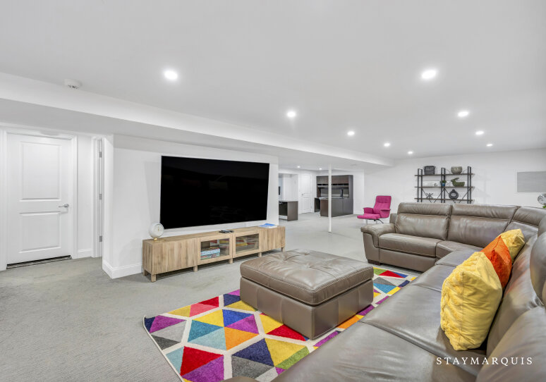 Step inside and be captivated by the home's open layout and abundance of natural light. The estate is equipped with modern conveniences such as WiFi, a washer and dryer, and central AC, ensuring a comfortable stay. The open living spaces flow seamlessly from the living room, with its cozy fireplace, to the elegant dining room and gourmet kitchen. The kitchen is a chef's dream, featuring top-of-the-line appliances and a coffee maker. For those needing to work from home, there is a dedicated workspace, and the finished lower level includes an additional media area and office.