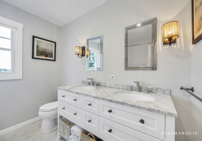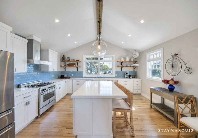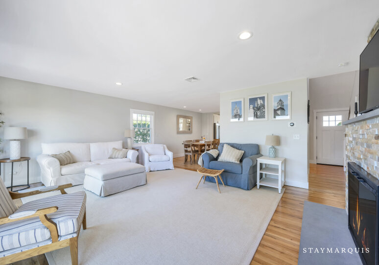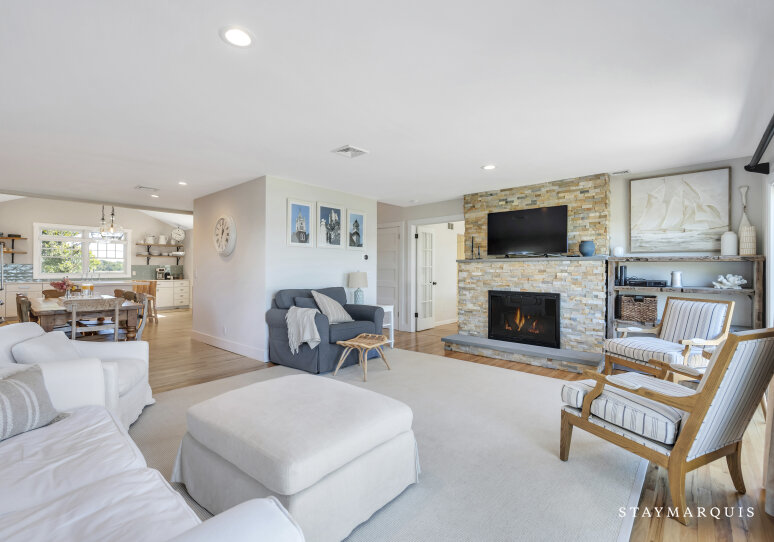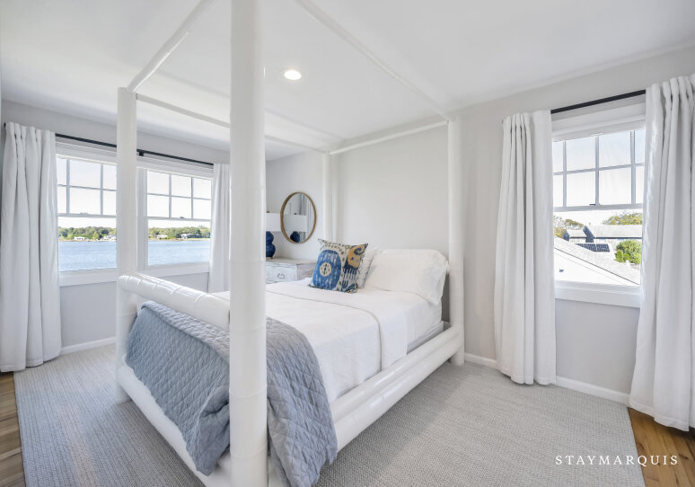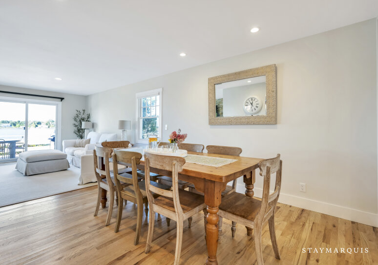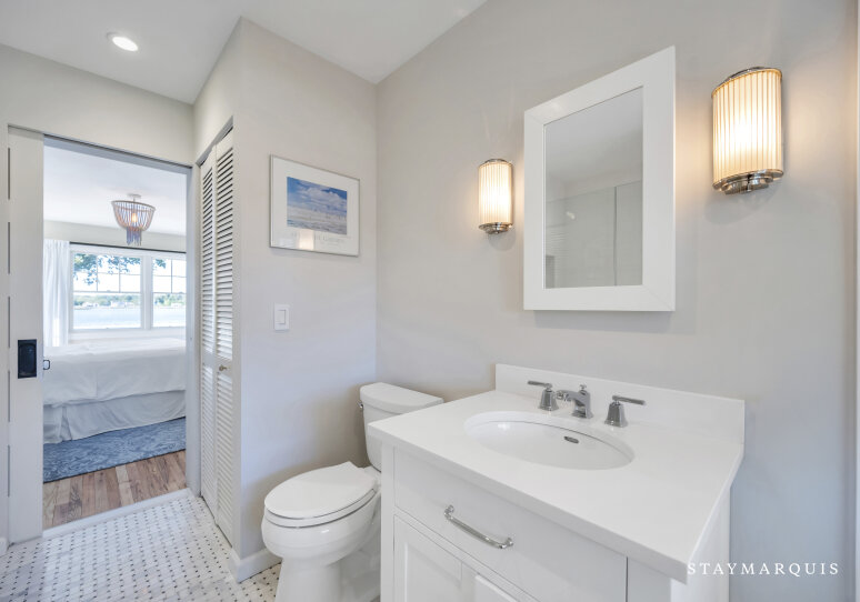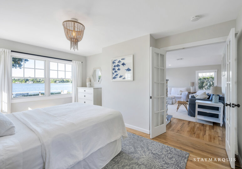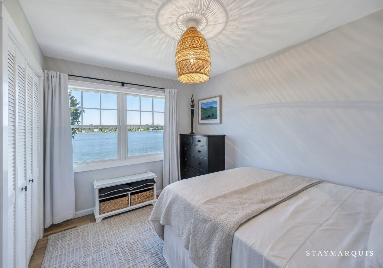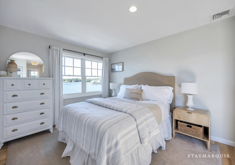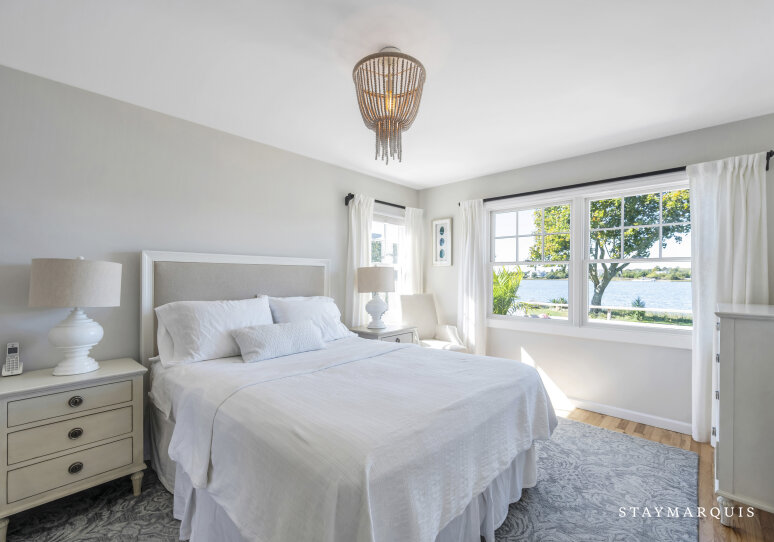 Nestled along the tranquil waterfront, this exquisite four-bedroom, three-bath retreat embodies the effortless sophistication of coastal living. Designed for discerning travelers, the home combines contemporary elegance with a relaxed seaside sensibility. Light, airy interiors create an atmosphere of calm, with expansive glass doors opening to sweeping water views from nearly every room. The newly renovated space features crisp, neutral tones, plush furnishings, and natural textures that echo the beauty of its surroundings. With a spacious open-concept layout, multiple gathering spaces, and a deck that seamlessly extends from the living area, this residence invites guests to unwind in comfort while taking in the ever-changing hues of the bay.