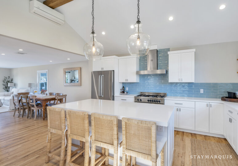 Inside, the home’s open floor plan welcomes guests with sunlit spaces and an easy flow between the living, dining, and kitchen areas. The living room, anchored by an oversized sectional and accented with coastal-inspired décor, offers a perfect spot to gather and enjoy panoramic water views through floor-to-ceiling sliding doors. The modern kitchen is a dream for entertaining, equipped with all the essentials—from cookware and dishes to full-sized appliances—ensuring every meal feels as effortless as it is elegant. Whether sharing morning coffee as light pours through the windows or hosting an evening soiree with the doors open to the deck, guests will find every modern comfort at hand, including central air conditioning, high-speed Wi-Fi, and a washer and dryer for convenience.
