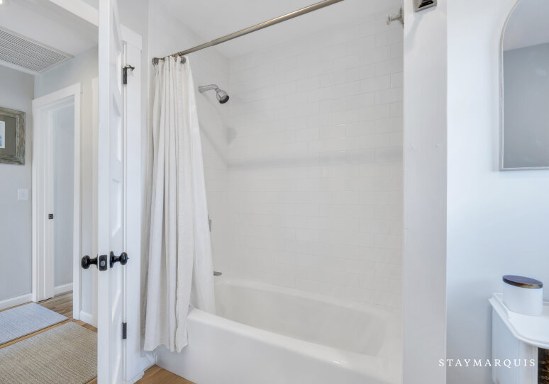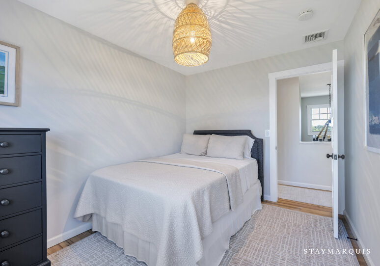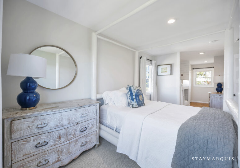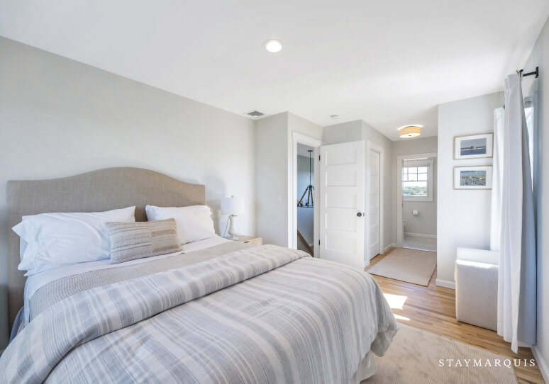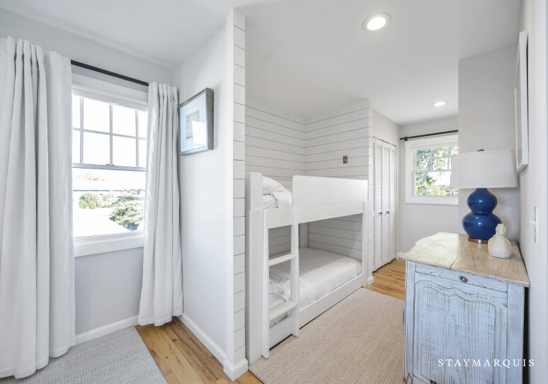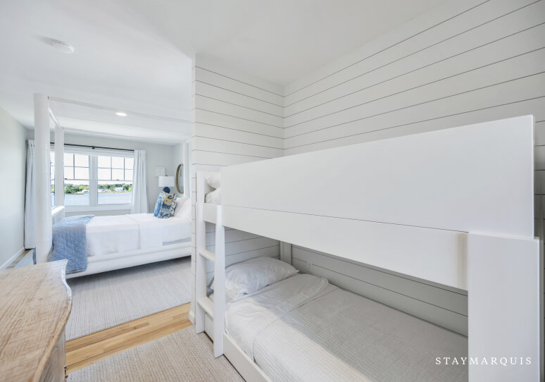 The home’s four bedrooms and three full bathrooms are designed with both comfort and privacy in mind. The serene primary suite is located on the lower level, featuring a queen bed, soft linens, and a private ensuite bath—a peaceful retreat after a day of seaside adventure. Upstairs, three additional guest bedrooms each offer queen beds dressed in crisp, luxurious bedding. One bedroom also includes a cozy set of bunk beds, perfect for families or additional guests. An ensuite bath complements one of the second-floor bedrooms, while the remaining two share a bright and well-appointed hall bath. Each space reflects the home’s signature blend of refined simplicity and relaxed coastal charm, ensuring restful nights for all.