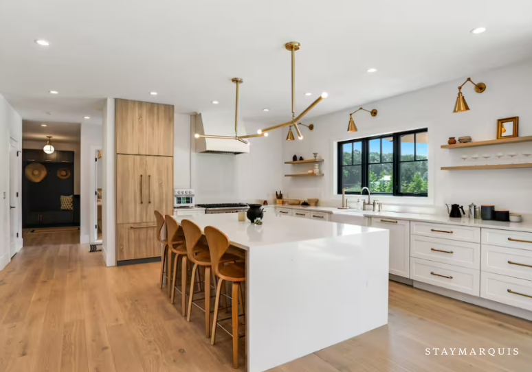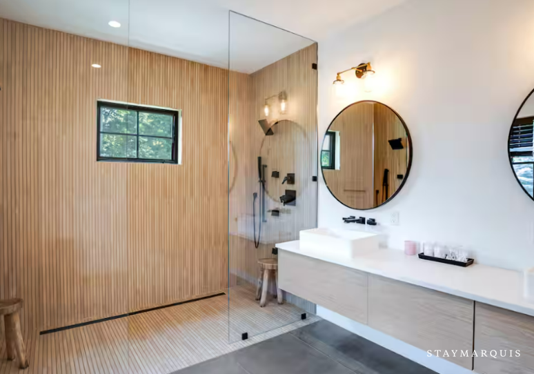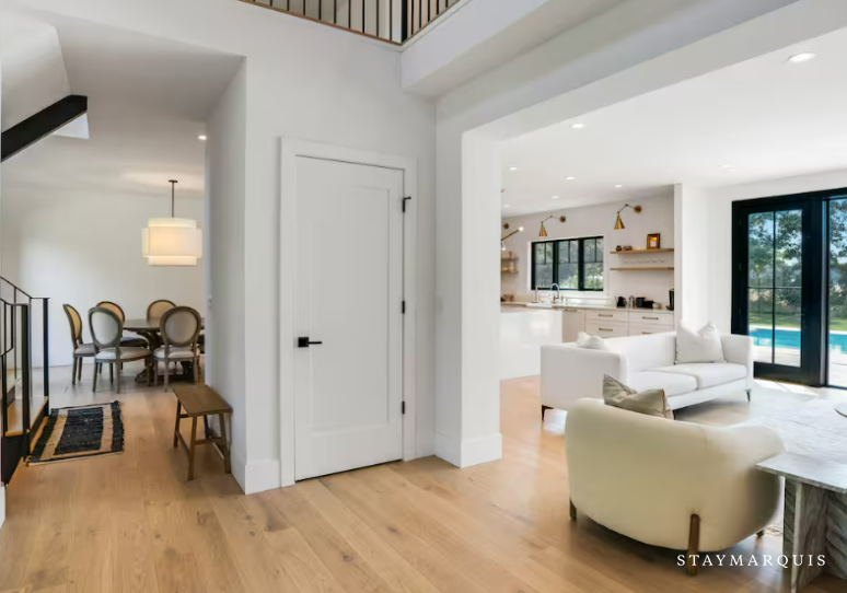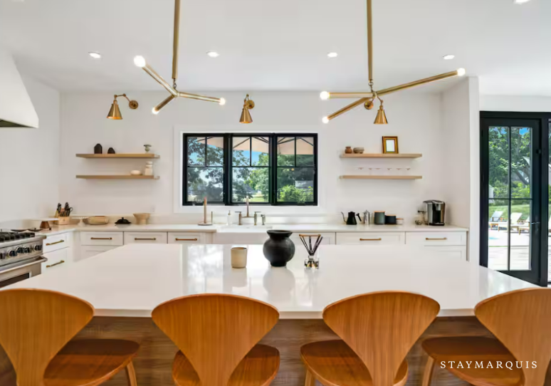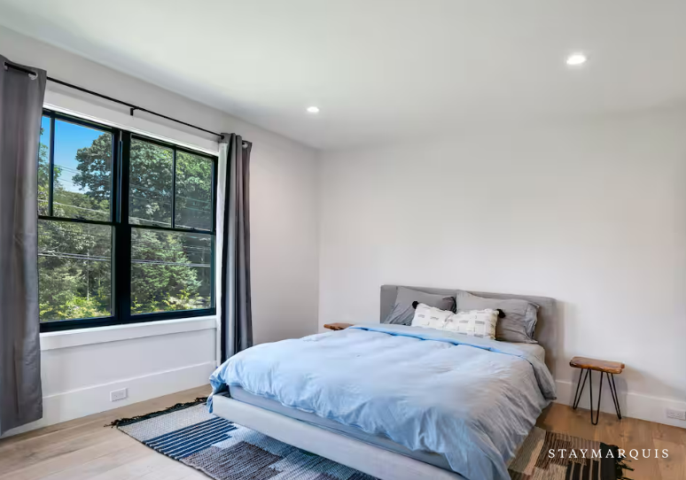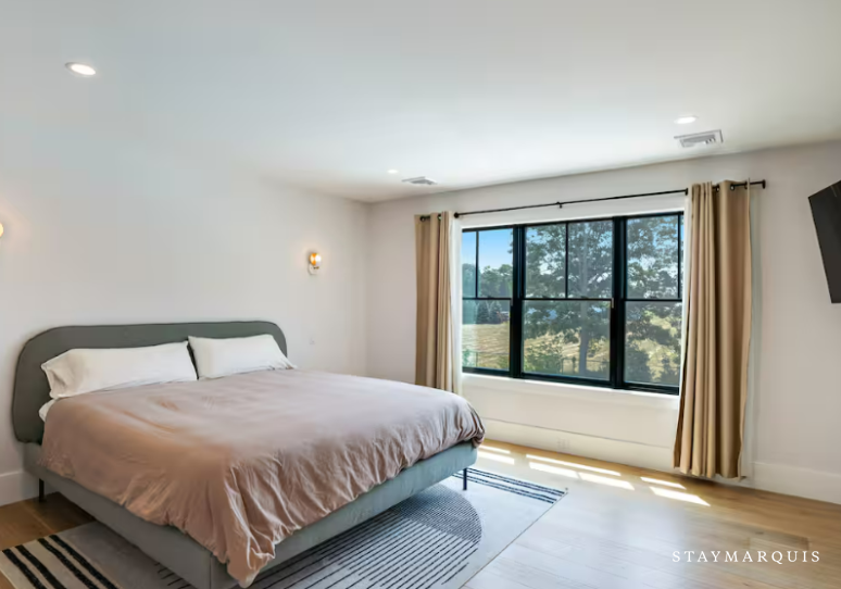 Inside, the home unfolds with light, openness, and modern sophistication. The open floorplan allows guests to move seamlessly from one space to the next, creating a natural flow that encourages togetherness without sacrificing comfort. Floor-to-ceiling windows and thoughtfully placed glass doors flood the interior with natural light, bringing the outdoors in and highlighting the home’s clean lines and warm finishes. Central air conditioning ensures comfort throughout the seasons, while high-speed WiFi keeps guests connected when needed.