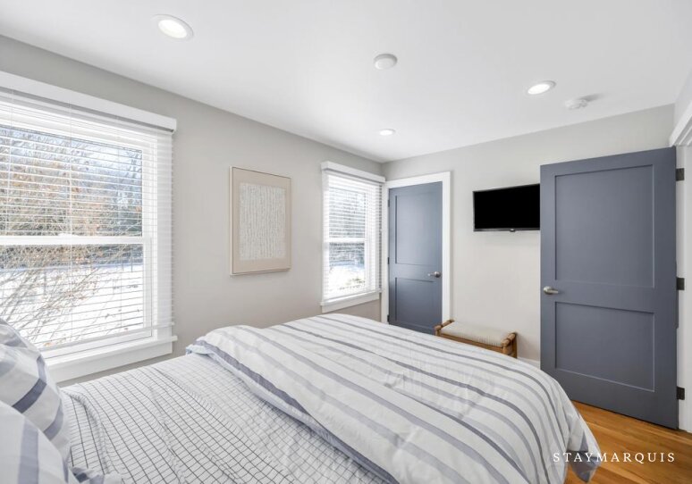 Inside, the home boasts an open layout filled with natural light, flowing seamlessly from the living area to the dining room and gourmet kitchen. The kitchen is equipped with top-of-the-line appliances, a coffee maker, and plenty of counter space, making it easy to prepare everything from simple breakfasts to elaborate dinners. The living areas are designed for both comfort and connection, offering cozy seating, modern finishes, and a welcoming atmosphere where everyone can gather. Guests will also enjoy modern conveniences such as WiFi, central air conditioning, and a washer and dryer, ensuring a seamless, comfortable stay. For those blending work and leisure, the laptop-friendly workspace provides a quiet, functional area for productivity while staying connected.