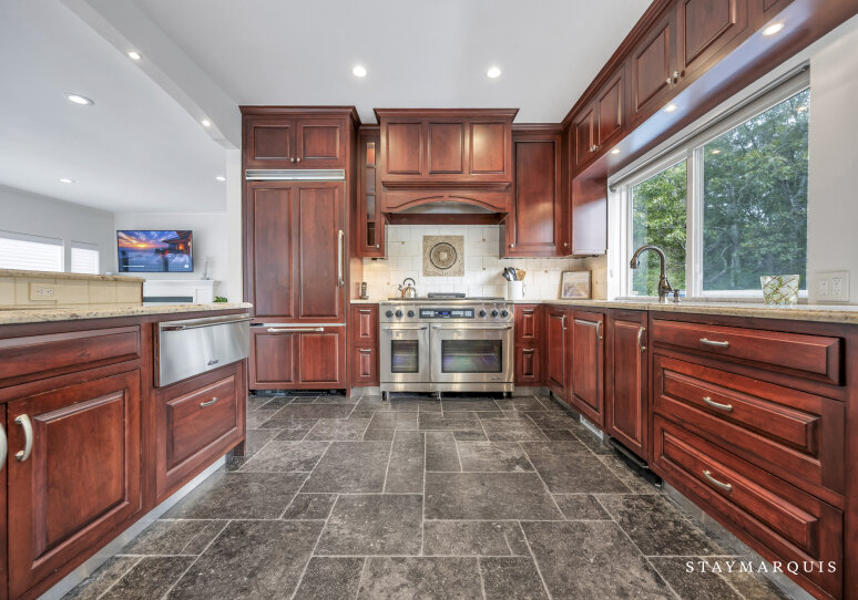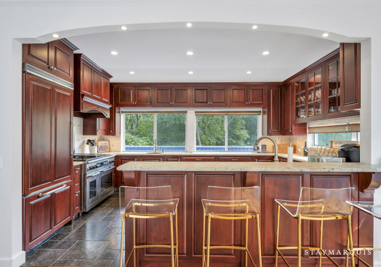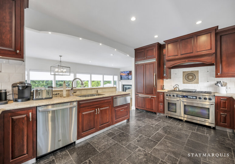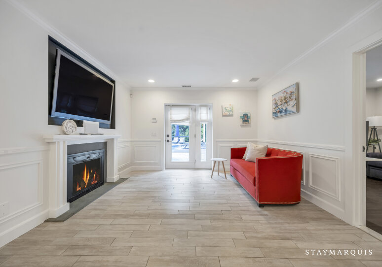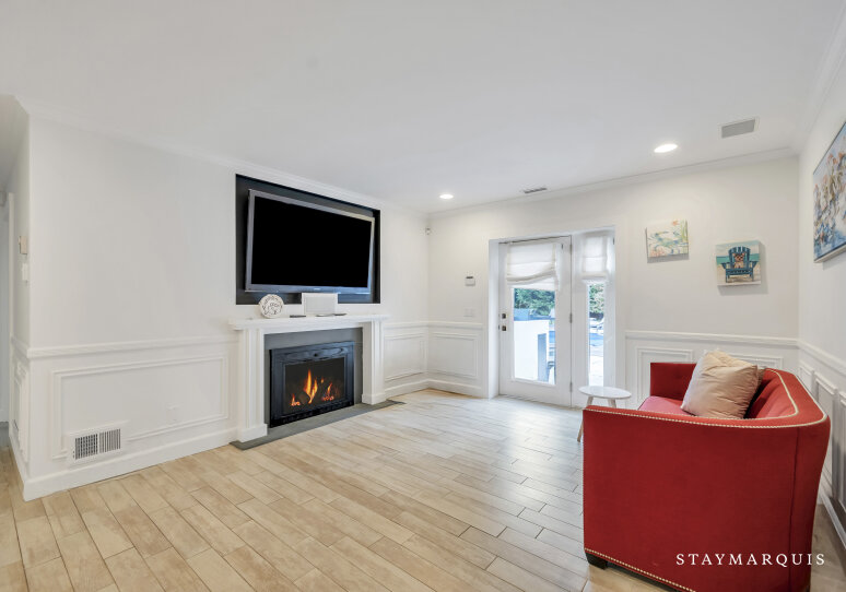 The fully equipped kitchen boasts top-of-the-line appliances, offering a culinary playground for cooking enthusiasts. Adjacent to the kitchen, the stylish living room features a cozy fireplace and a big-screen TV, perfect for a family movie night or a lazy Sunday afternoon. A wall of windows and glass doors offers a glimpse of the paradise that awaits outside while allowing easy access to the back deck.