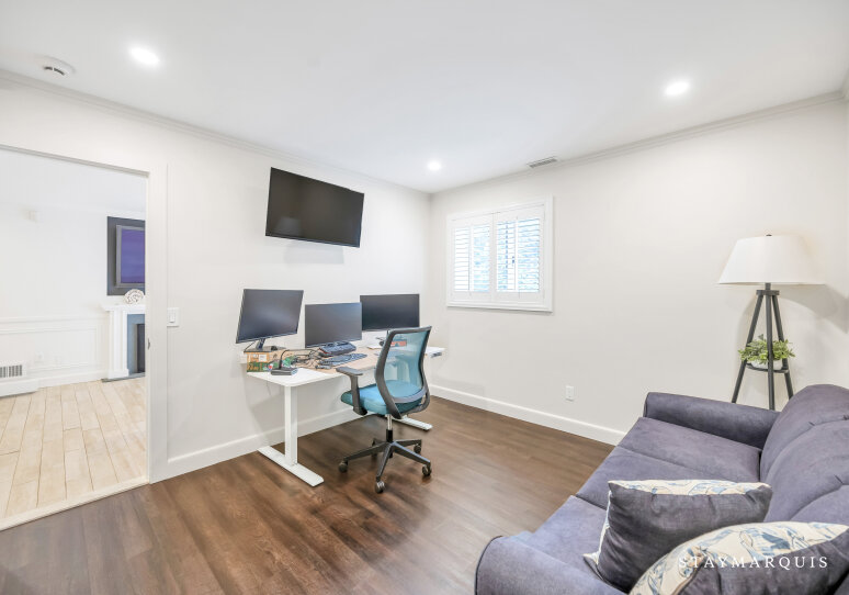 Descend to the finished lower level, where you'll discover a spacious media area, perfect for hosting game nights or simply unwinding. The adjacent home office offers an ideal space for those who need to catch up on work, plus it doubles as an extra sleeping area, perfect for overnight guests or family members seeking a quiet retreat.