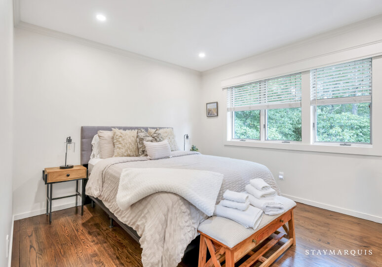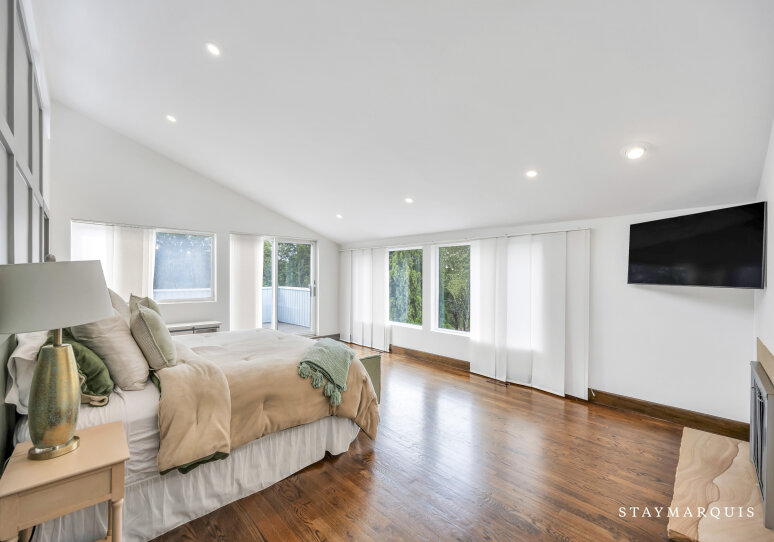 Inside, the five comfortable bedrooms have been designed with restful nights in mind. Each is dressed with fresh, high-quality linens and features tasteful décor that reflects the home's serene surroundings. On the second floor, you'll find the Master suite offering the ultimate in privacy, with an ensuite bath with a large shower, and a soaking tub. The master bedroom opens onto an outdoor deck, a perfect place to enjoy your morning coffee. The remaining four bathrooms are stocked with all the essentials you need, promising a hassle-free stay.