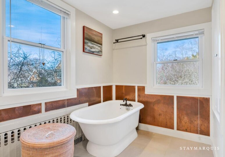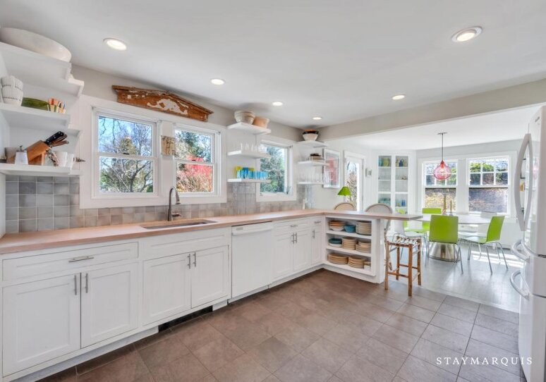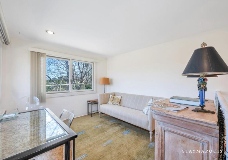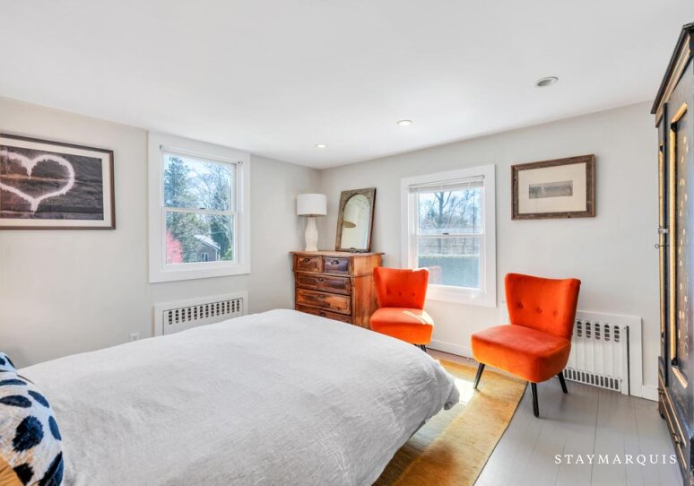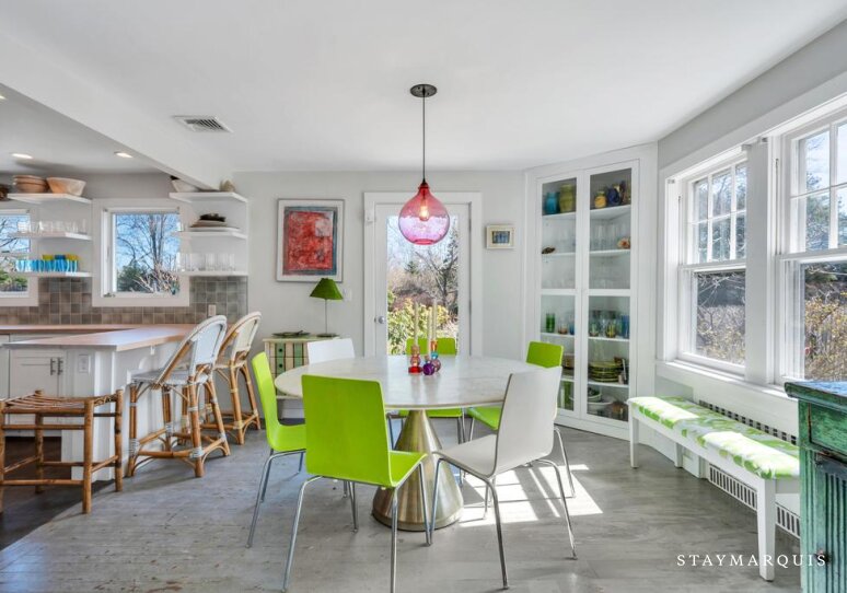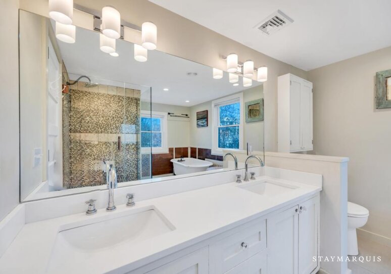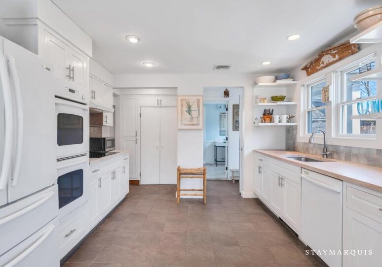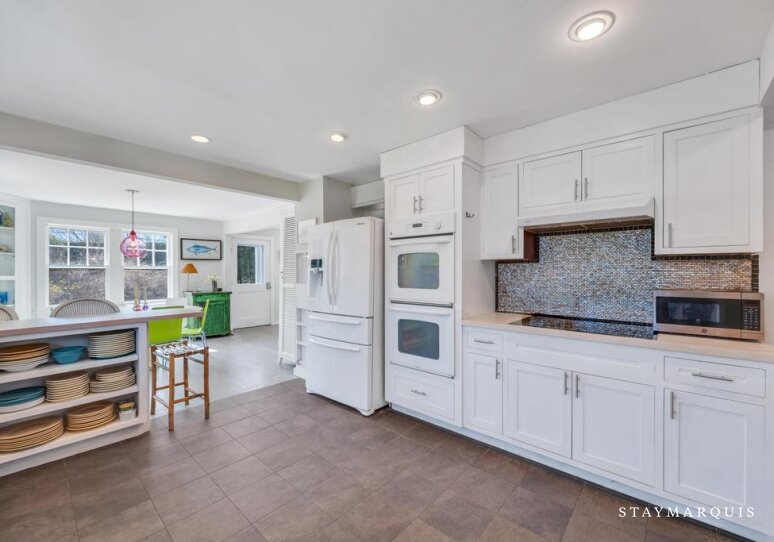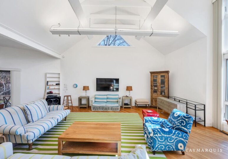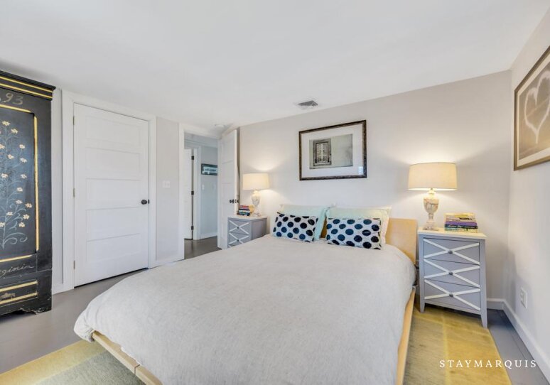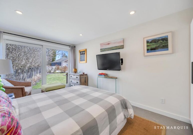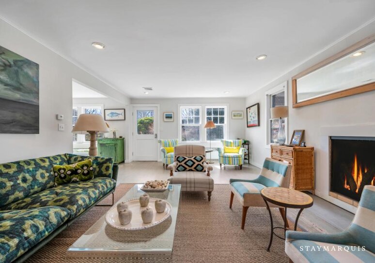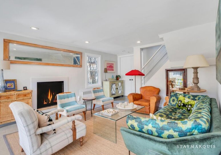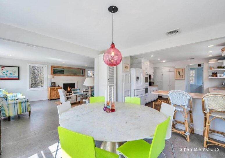Inside, the home is a light-filled sanctuary where style meets convenience. The open layout allows natural light to flood every corner, accentuating the sophisticated décor and thoughtful design. The living room flows seamlessly into the dining area and gourmet kitchen, making it easy to entertain or relax in comfort. The kitchen is outfitted with top-of-the-line appliances, including a Nespresso machine, and is fully stocked with everything a guest could need to prepare meals with ease. Modern conveniences such as high-speed Wi-Fi, central air conditioning, a washer and dryer, and Sonos sound system ensure a comfortable and connected stay. From morning coffee in the sunlit dining area to evening cocktails in the living room, the home is designed for effortless living, where every space flows naturally and intuitively to enhance both leisure and social connection.