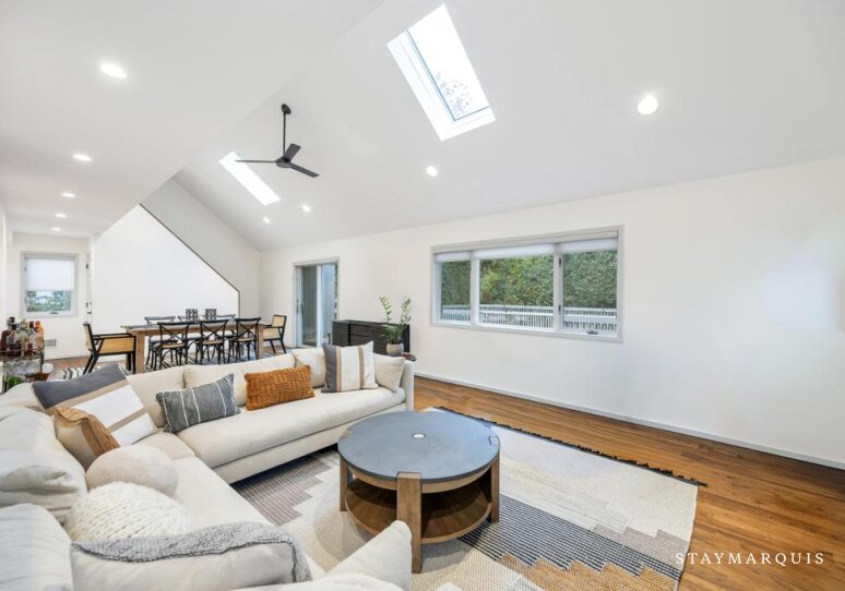 Inside, the home’s open layout welcomes an abundance of natural light, casting a warm, inviting glow across every corner. Guests will find a harmonious flow between the living room, dining area, and gourmet kitchen, ideal for both relaxation and entertaining. The living space is outfitted with plush seating, creating the perfect environment for curling up with a book or gathering for lively conversation. High-speed Wi-Fi ensures connectivity when needed, while a full washer and dryer provide convenience for longer stays. Central air conditioning keeps the home comfortably cool during the warm summer months. The kitchen, a true centerpiece of the home, is equipped with top-of-the-line appliances, a professional-grade coffee maker, and everything required to craft everything from a casual breakfast to an elegant dinner. The thoughtful design encourages both culinary exploration and seamless socializing, making this Southampton retreat as practical as it is beautiful.