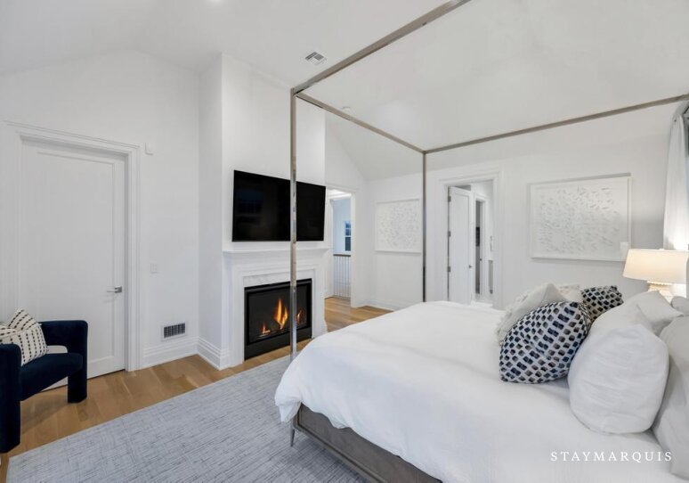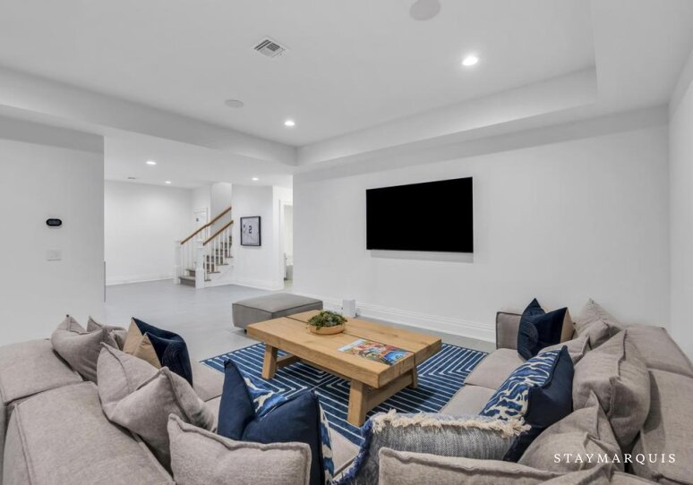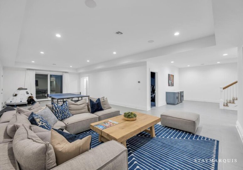 Inside, the home is designed with both elegance and functionality in mind. Natural light fills the expansive living spaces, highlighting contemporary design and thoughtful details throughout. The great room with a fireplace creates a cozy focal point for cooler evenings, while the gourmet island kitchen boasts top-of-the-line appliances, a coffee maker, a wine fridge, and plenty of counter space for cooking and entertaining. High-speed WiFi, central air conditioning, and a washer and dryer ensure a comfortable stay. Entertainment options include a ping pong table, a fully equipped gym, and integrated Sonos sound systems, providing both fun and relaxation for guests of all ages.