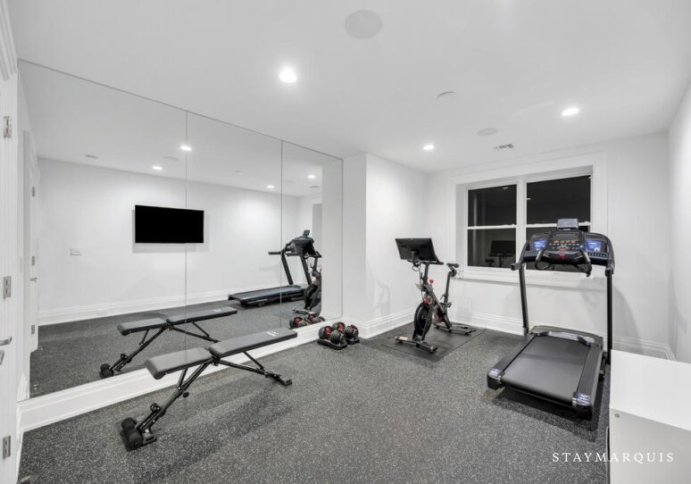 Bed Linens, Usable Fireplace (Gas), Air Conditioning (Central Air), Dryer, Heating, Internet (Wifi), Washer, Gym/Fitness Room (Treadmill, Stationary Bike, Weight Training Equipment), Garage (Attached), Hair Dryer, Iron/Ironing Board, Living Room, Parking, Bath Towels, Pool/Beach Towels, Microwave, Coffee (Pot, Other), Dishes and Silverware, Pots and Pans, Toaster, Blender, Ping Pong Table, Speaker System (Sonos), Television (Media Room), Private Entrance, Kitchen, Carbon Monoxide Detector, Smoke Detector, Hot Water, Refrigerator, Oven, Stove, Dishwasher, Cable TV, Electric Vehicle Charger, Fire Extinguisher, Essentials, Smart TV, Wine Fridge, Ice Maker, Laptop-Friendly Workspace, Privacy (Mostly Private)