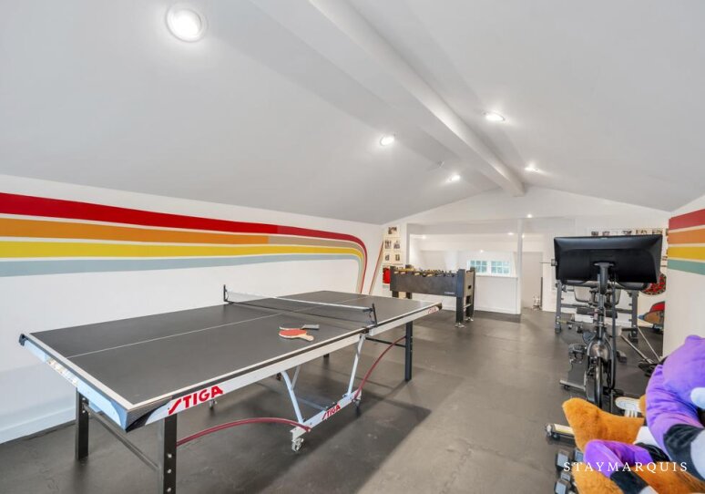 Bed Linens, Usable Fireplace (Wood-Burning), Air Conditioning (Central Air), Dryer, Heating, Internet (Wifi), Washer, Gym/Fitness Room (Stationary Bike, Weight Training Equipment, Stretching / Yoga Mat), Garage (Attached), Hair Dryer, Iron/Ironing Board, Living Room, Parking, Wood Stove, Bath Towels, Pool/Beach Towels, Microwave, Coffee (Nespresso, Other), Dishes and Silverware, Pots and Pans, Toaster, Blender, Ping Pong Table, Speaker System (Sonos), Television, Kitchen, Carbon Monoxide Detector, Smoke Detector, Hot Water, Refrigerator, Oven, Stove, Dishwasher, Cable TV, Electric Vehicle Charger, Fire Extinguisher, Essentials, Smart TV, Wine Fridge, Ice Maker, Laptop-Friendly Workspace, Privacy (Completely Private), Private Entrance